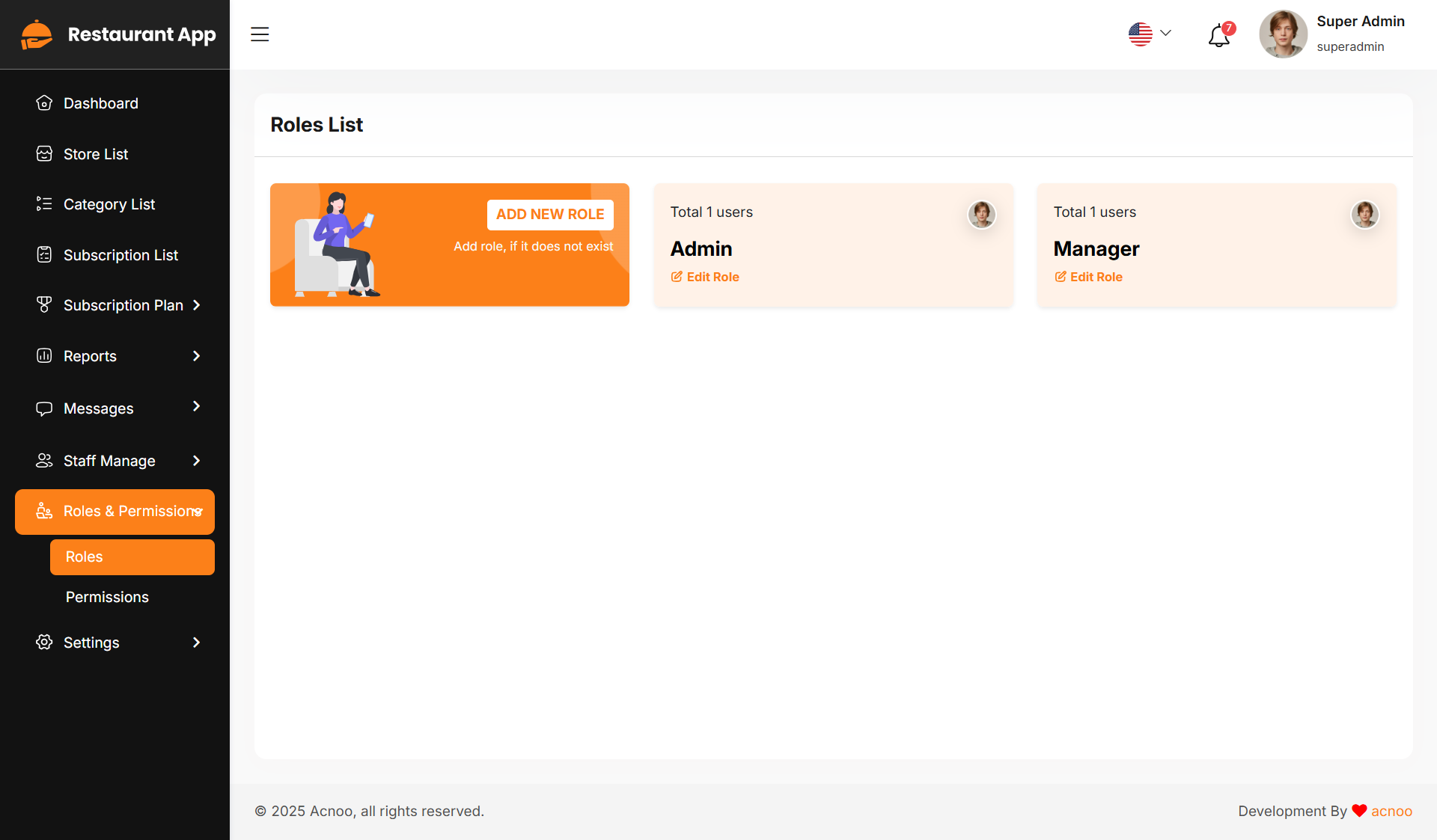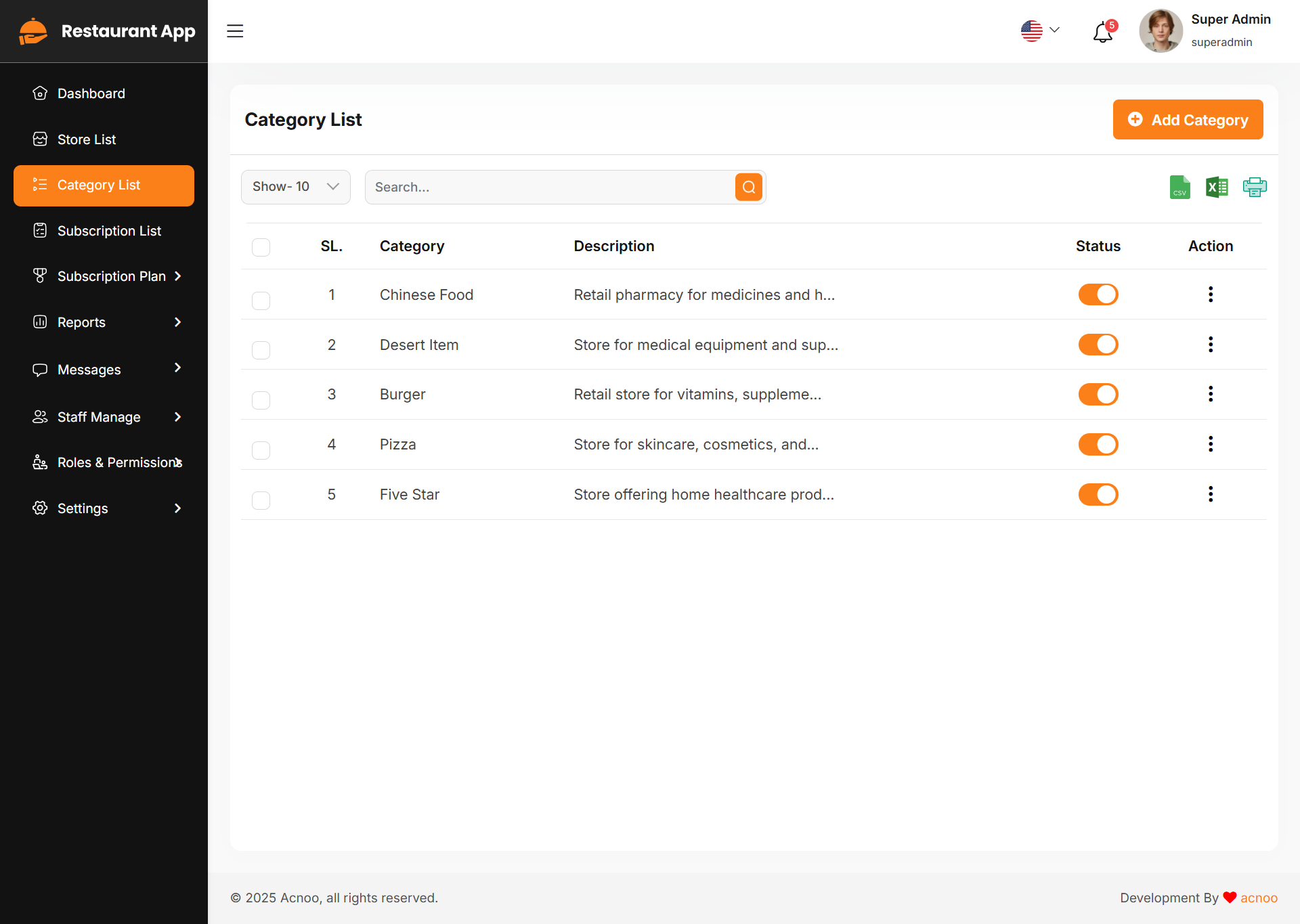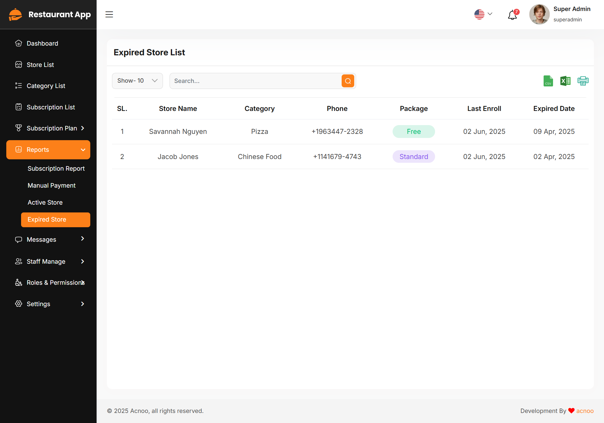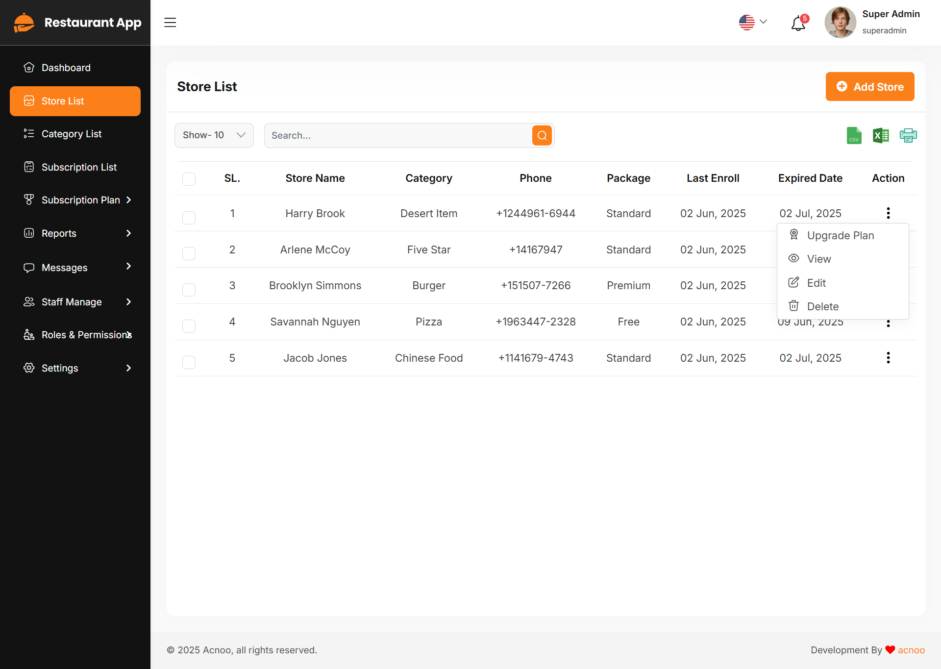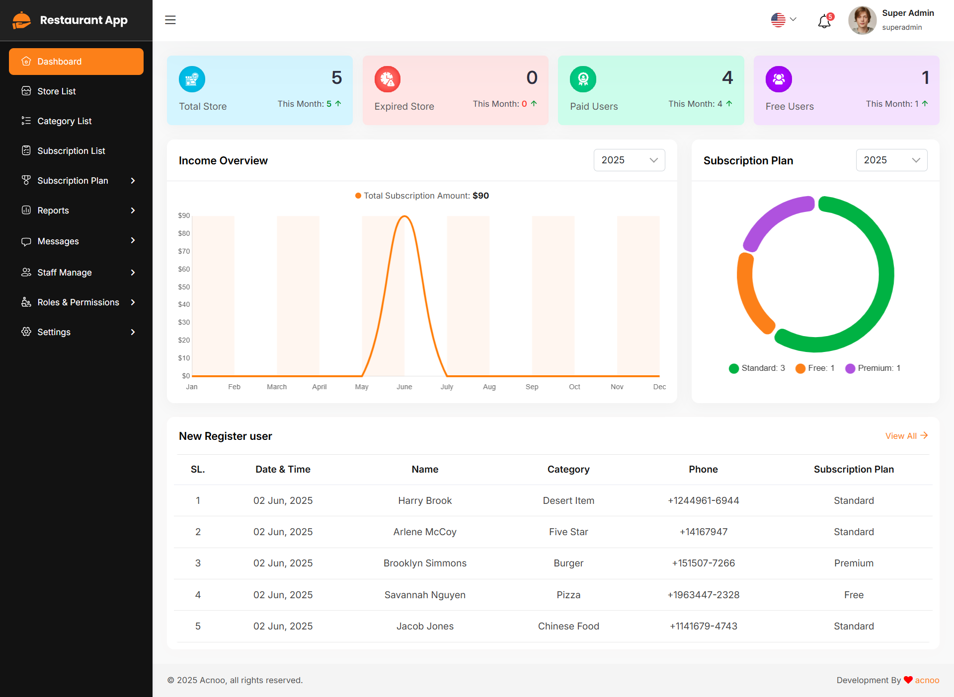 The Acoo Restaurant Admin Dashboard provides an intuitive interface for administrators to manage various aspects of the platform. It includes metrics on total Store, expired store, Paid Users, Free Users, subscription plan, income overview, and new register user.