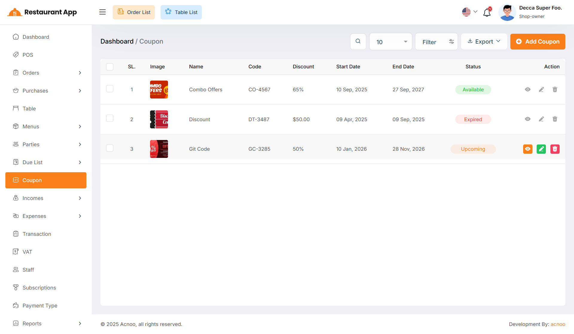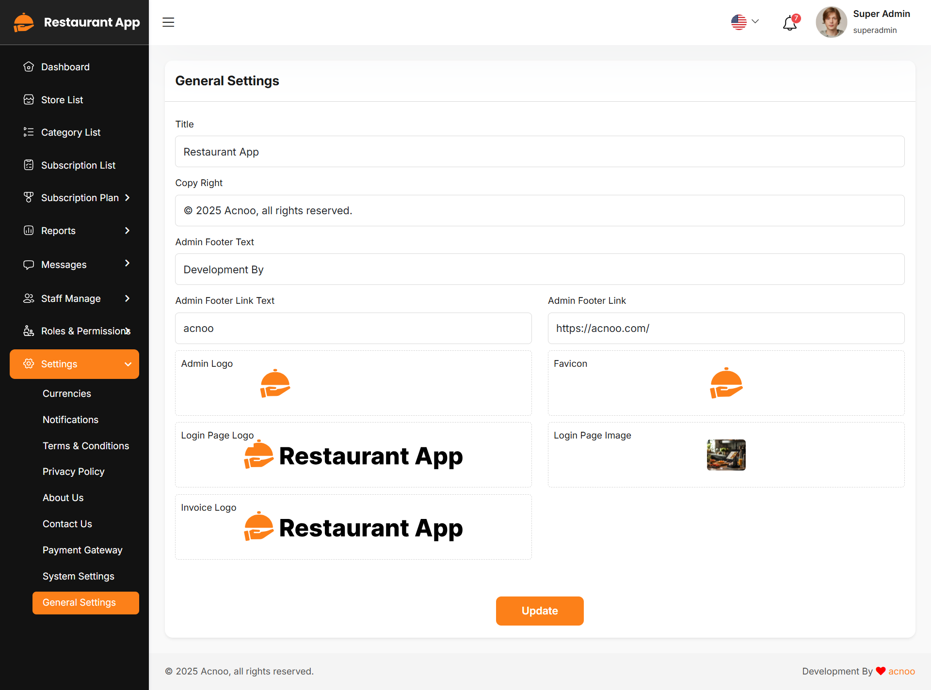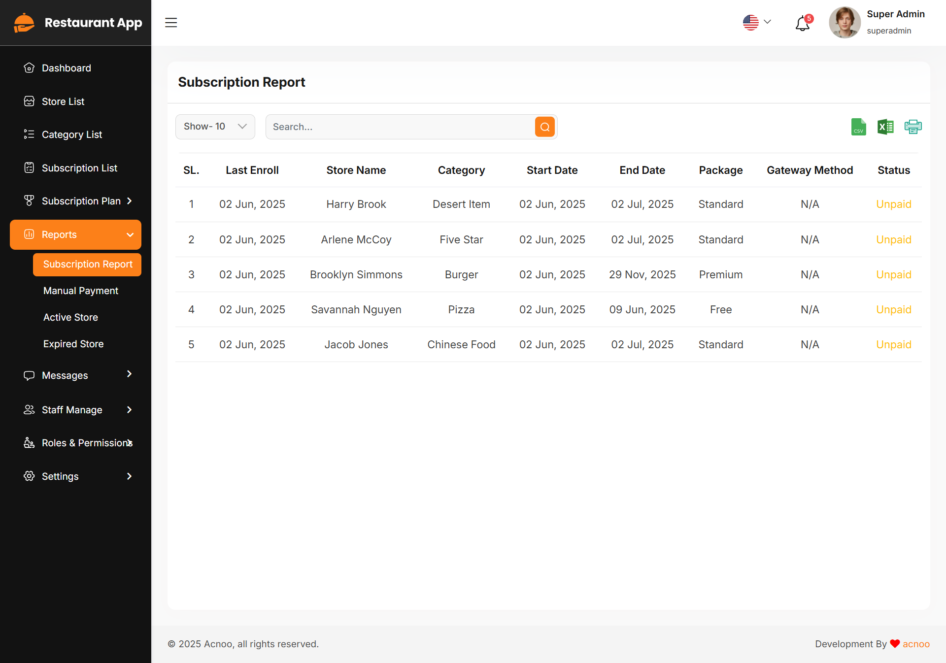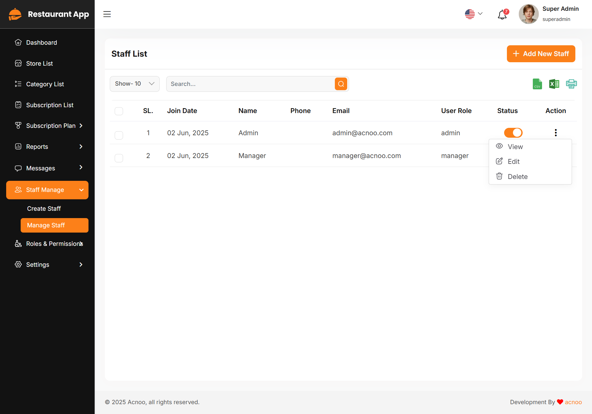 The Acoo Restaurant Admin Dashboard provides an intuitive interface for administrators to manage various aspects of the platform. It includes metrics on total Store, expired store, Paid Users, Free Users, subscription plan, income overview, and new register user.