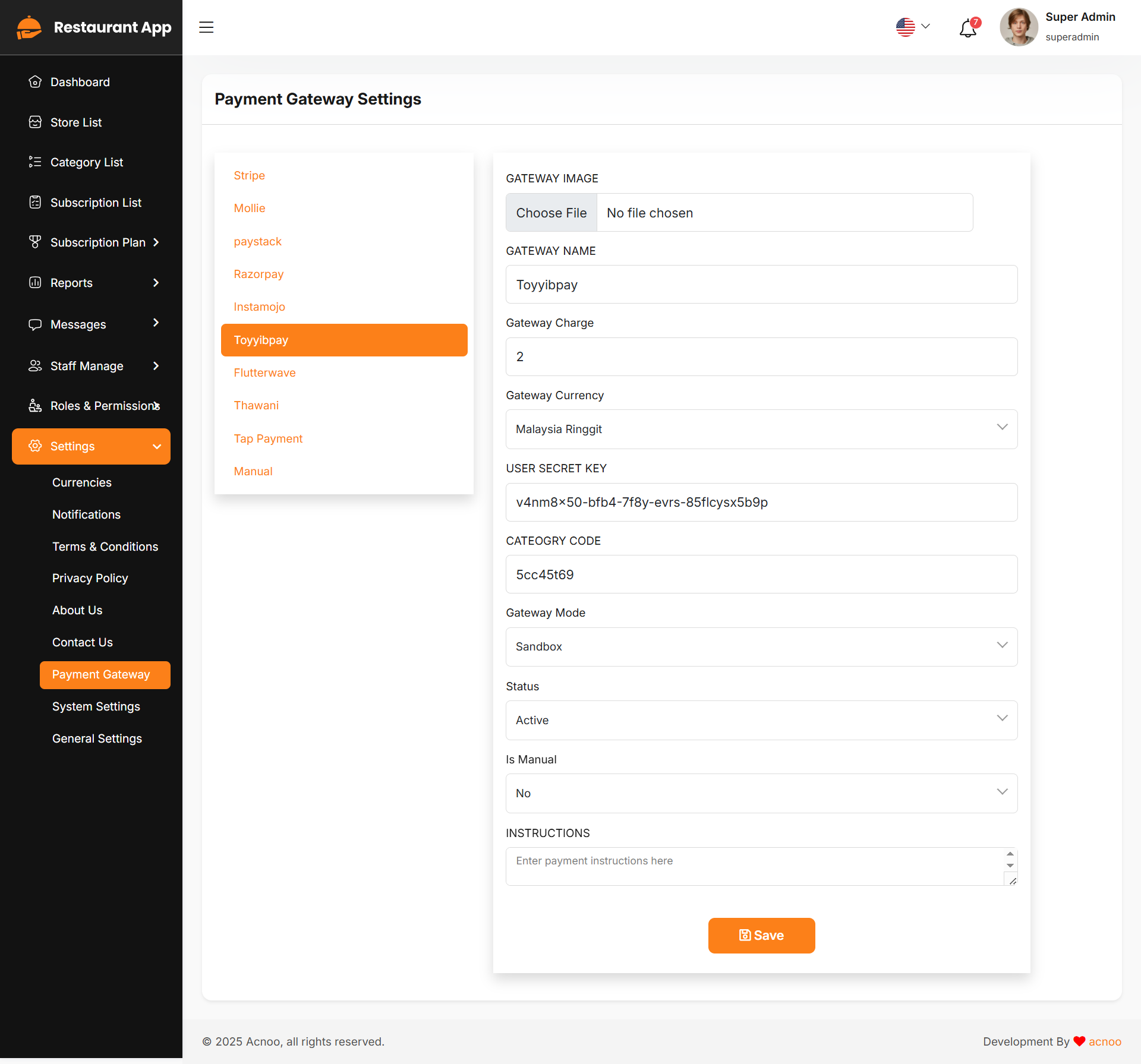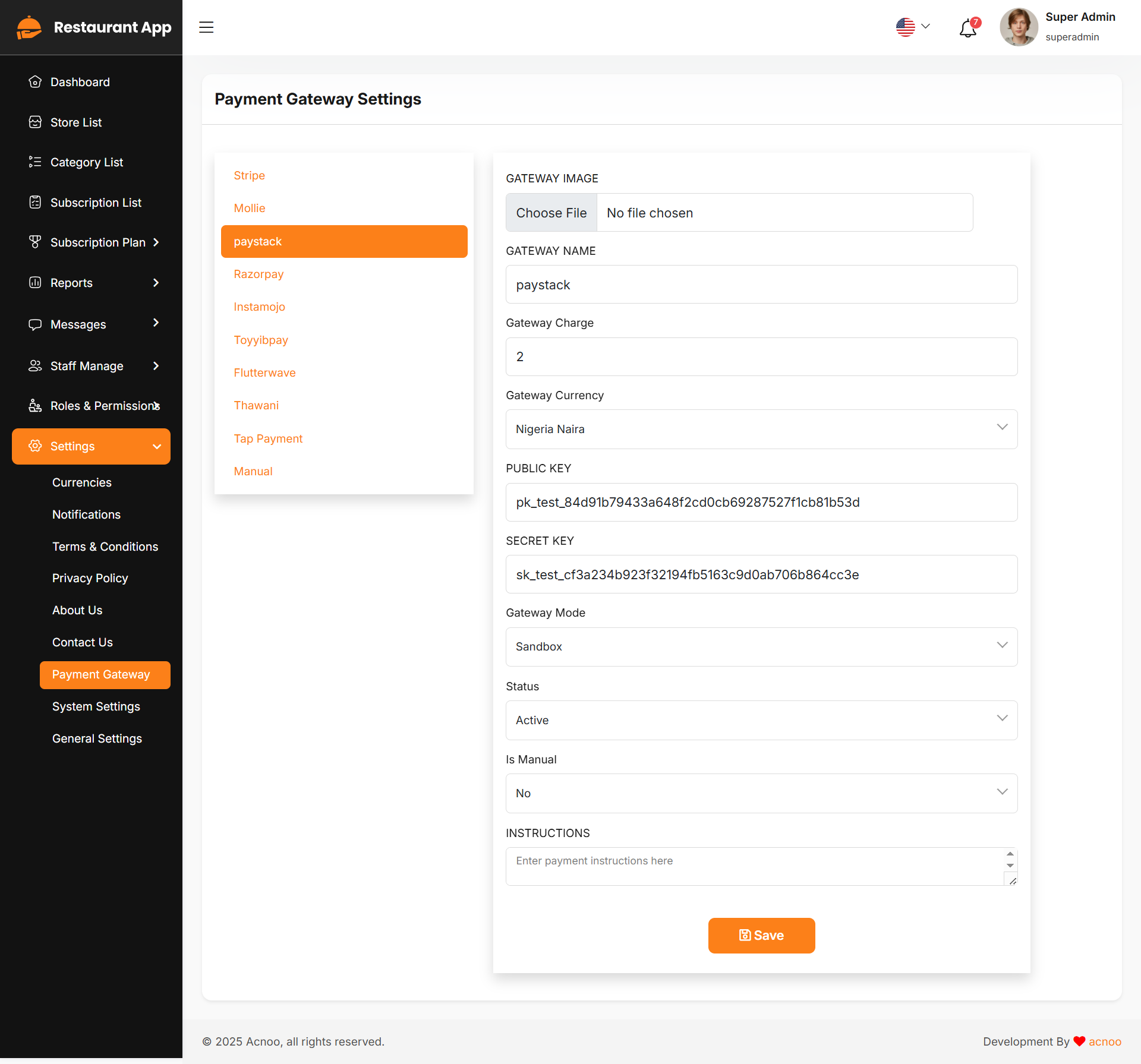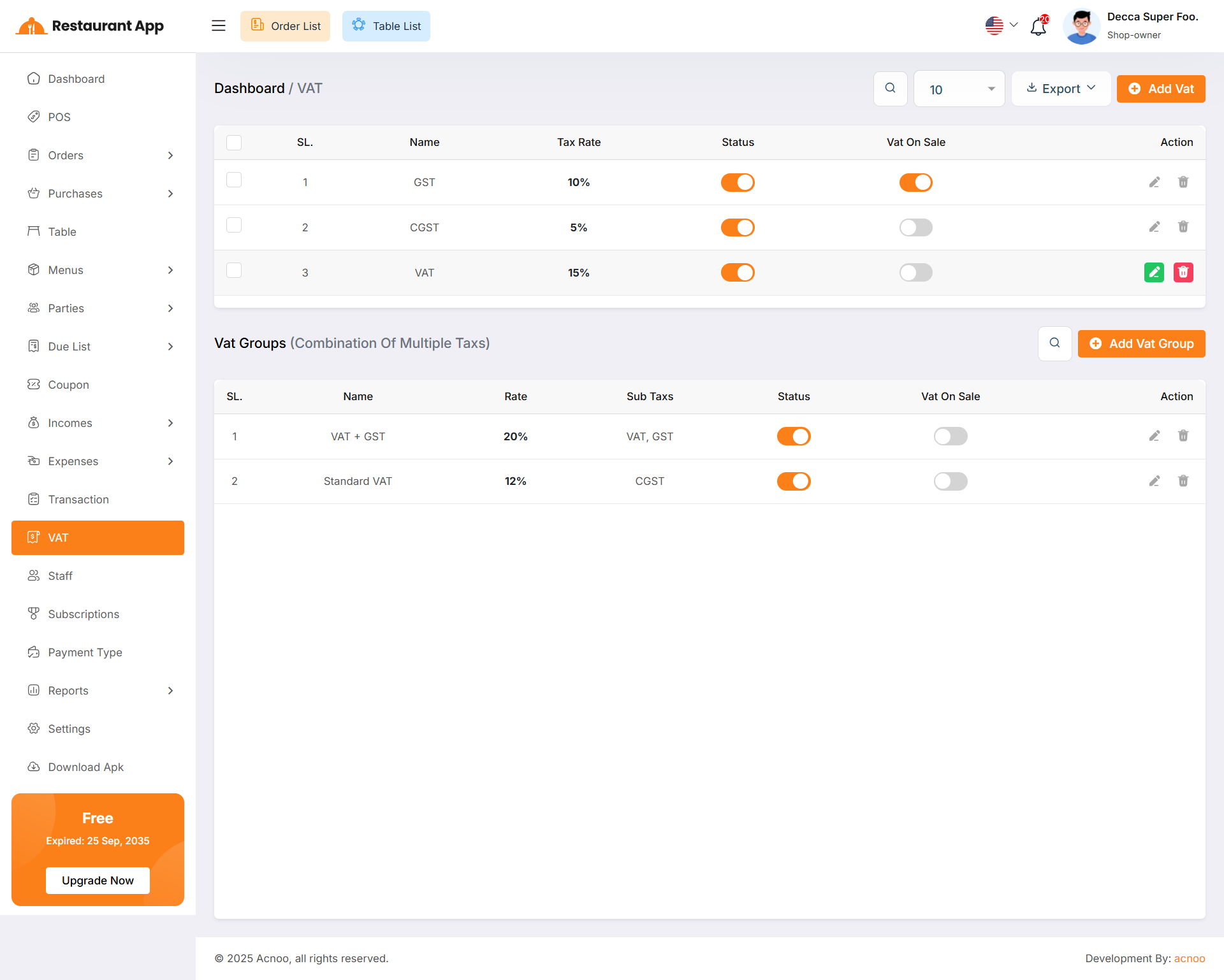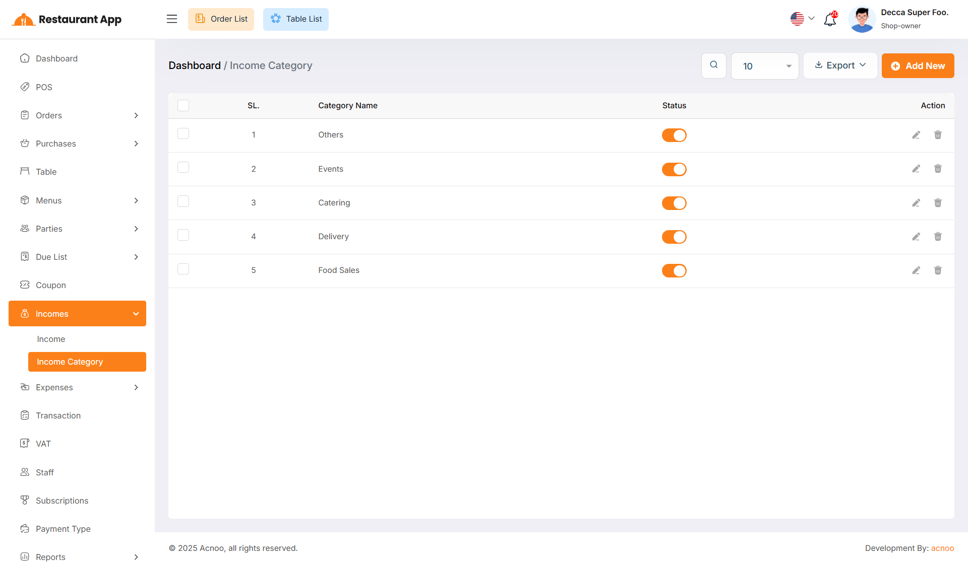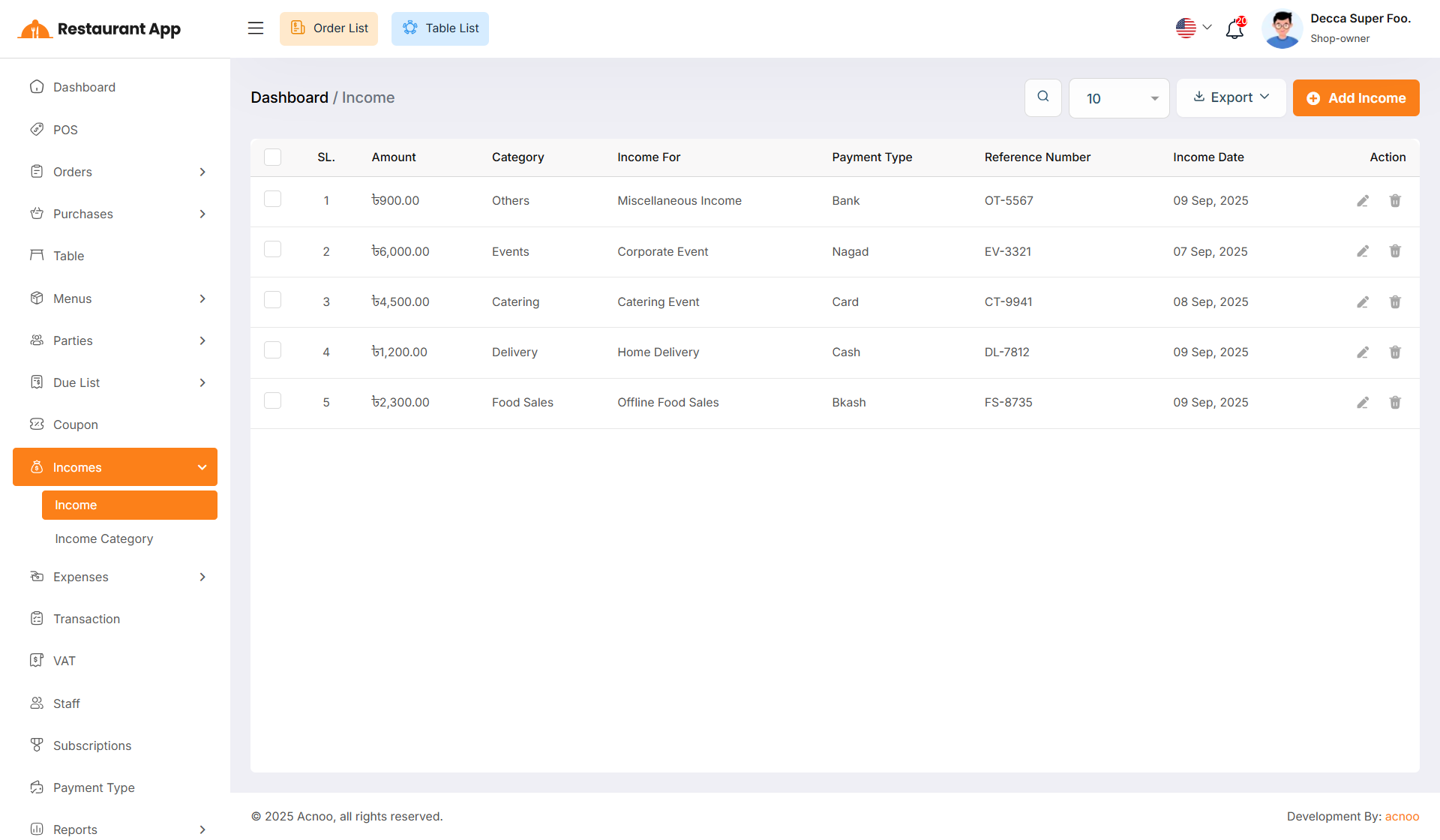 The Acoo Restaurant Admin Dashboard provides an intuitive interface for administrators to manage various aspects of the platform. It includes metrics on total Store, expired store, Paid Users, Free Users, subscription plan, income overview, and new register user.