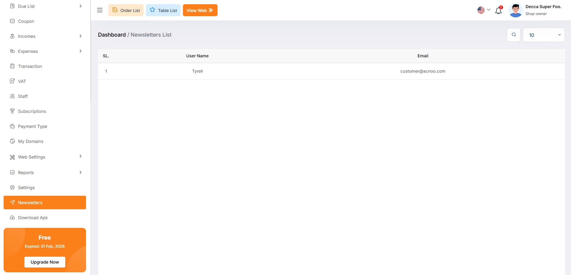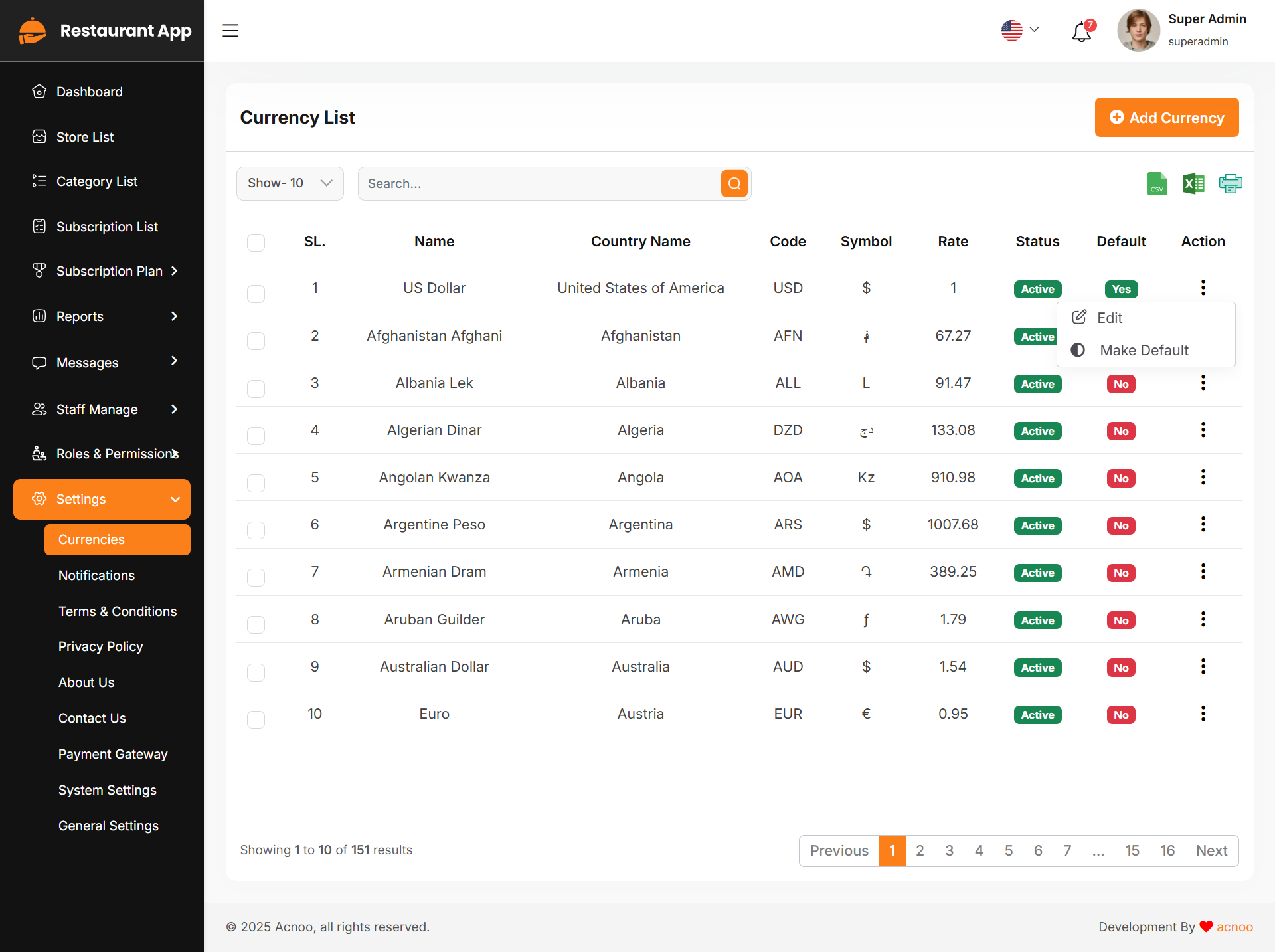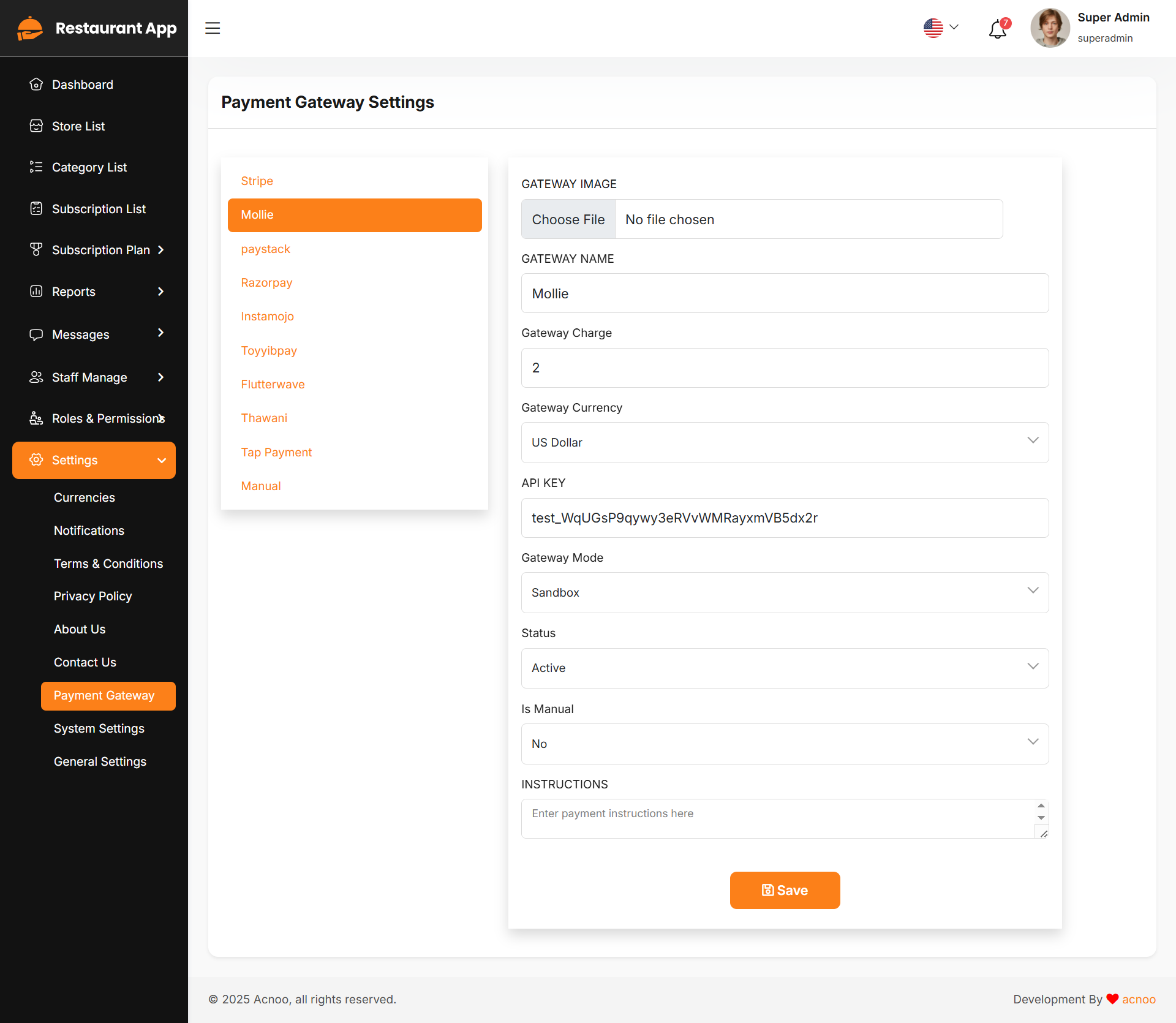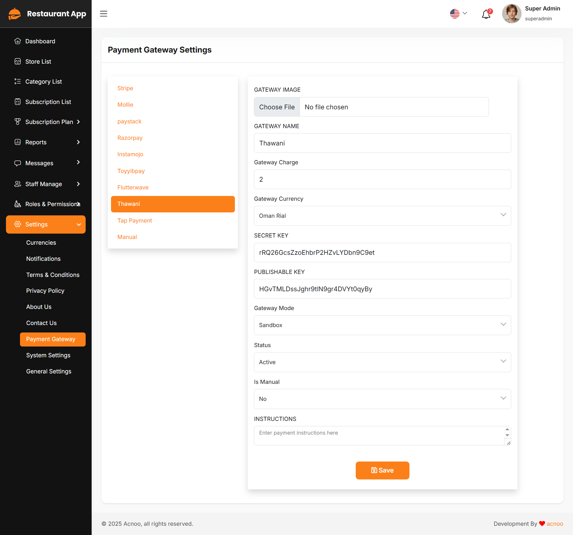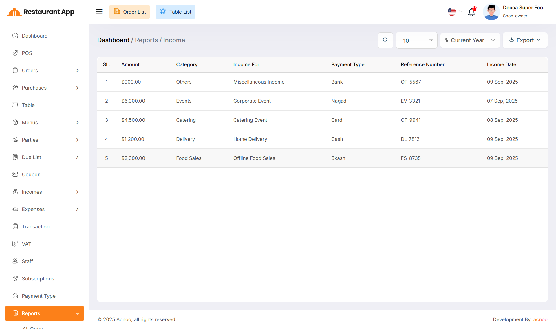 The Acoo Restaurant Admin Dashboard provides an intuitive interface for administrators to manage various aspects of the platform. It includes metrics on total Store, expired store, Paid Users, Free Users, subscription plan, income overview, and new register user.