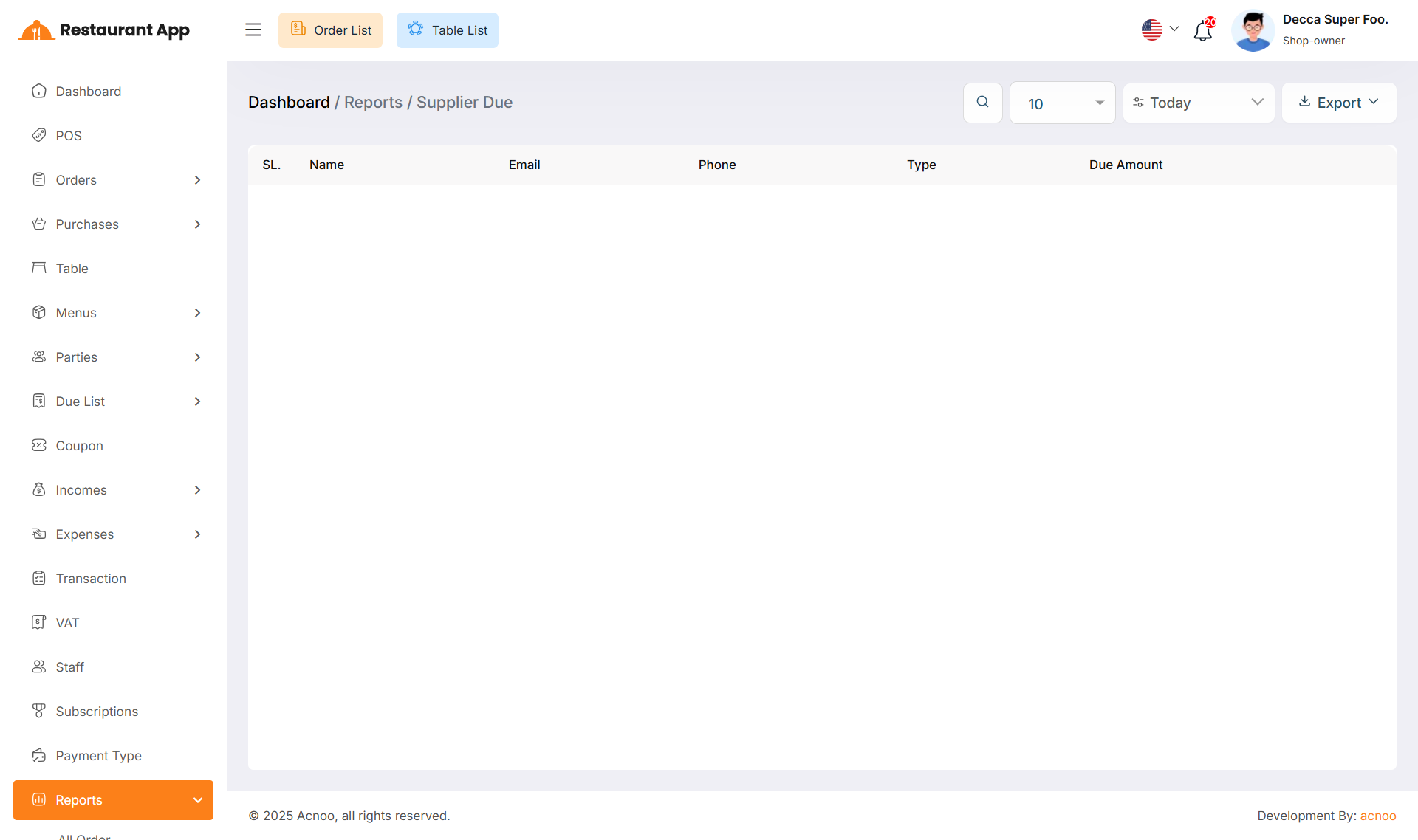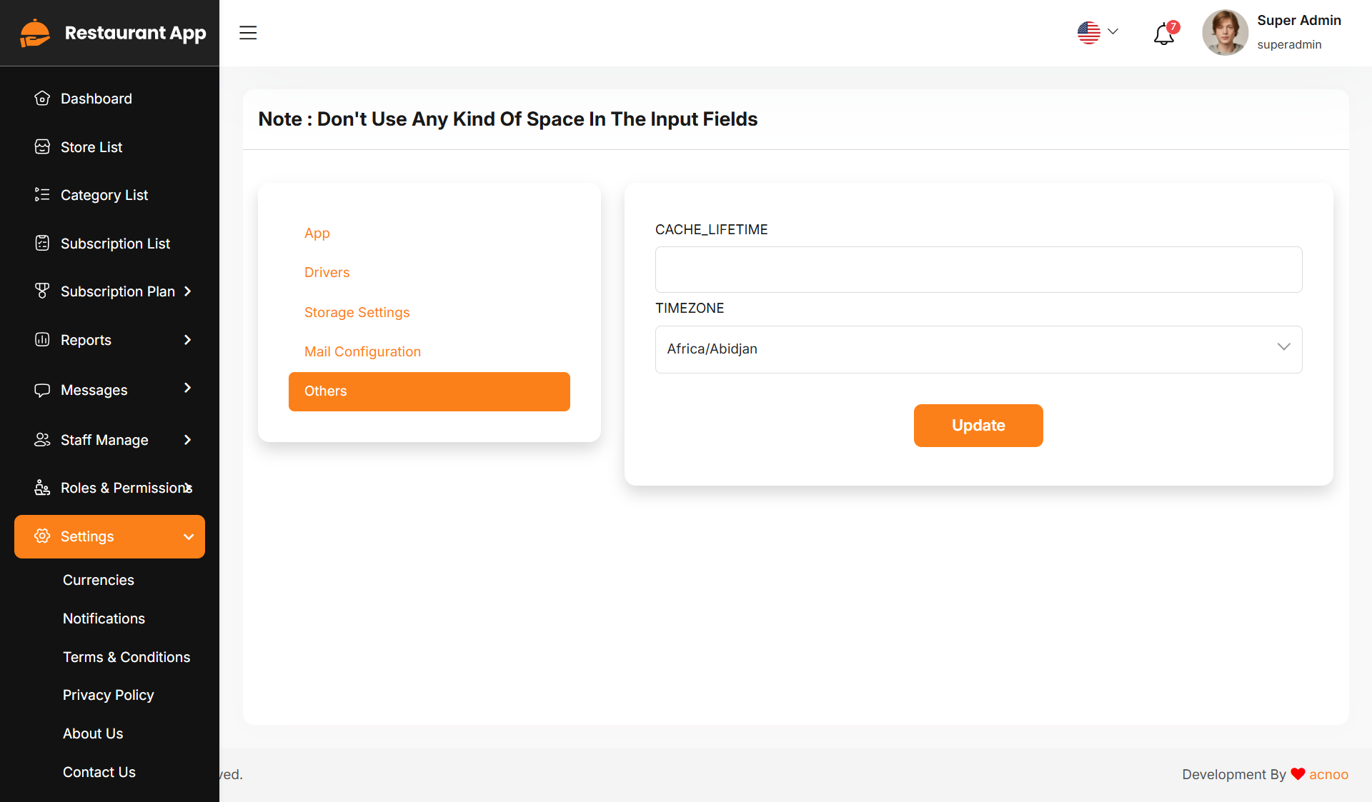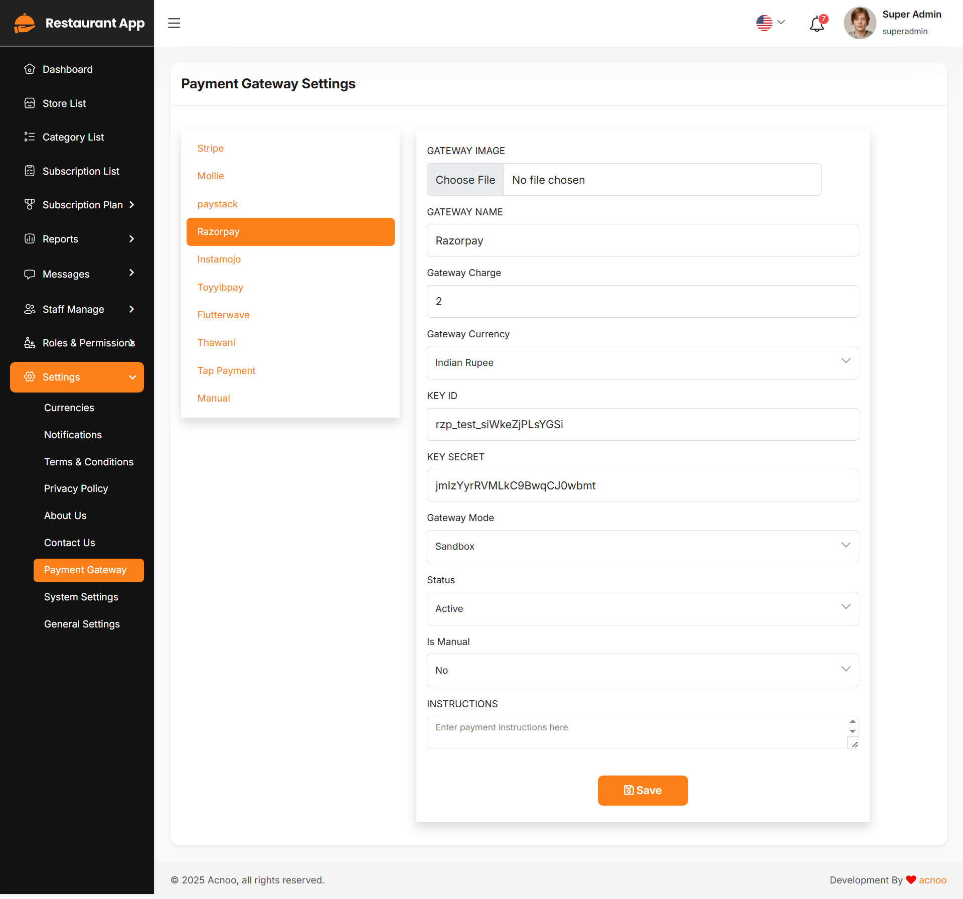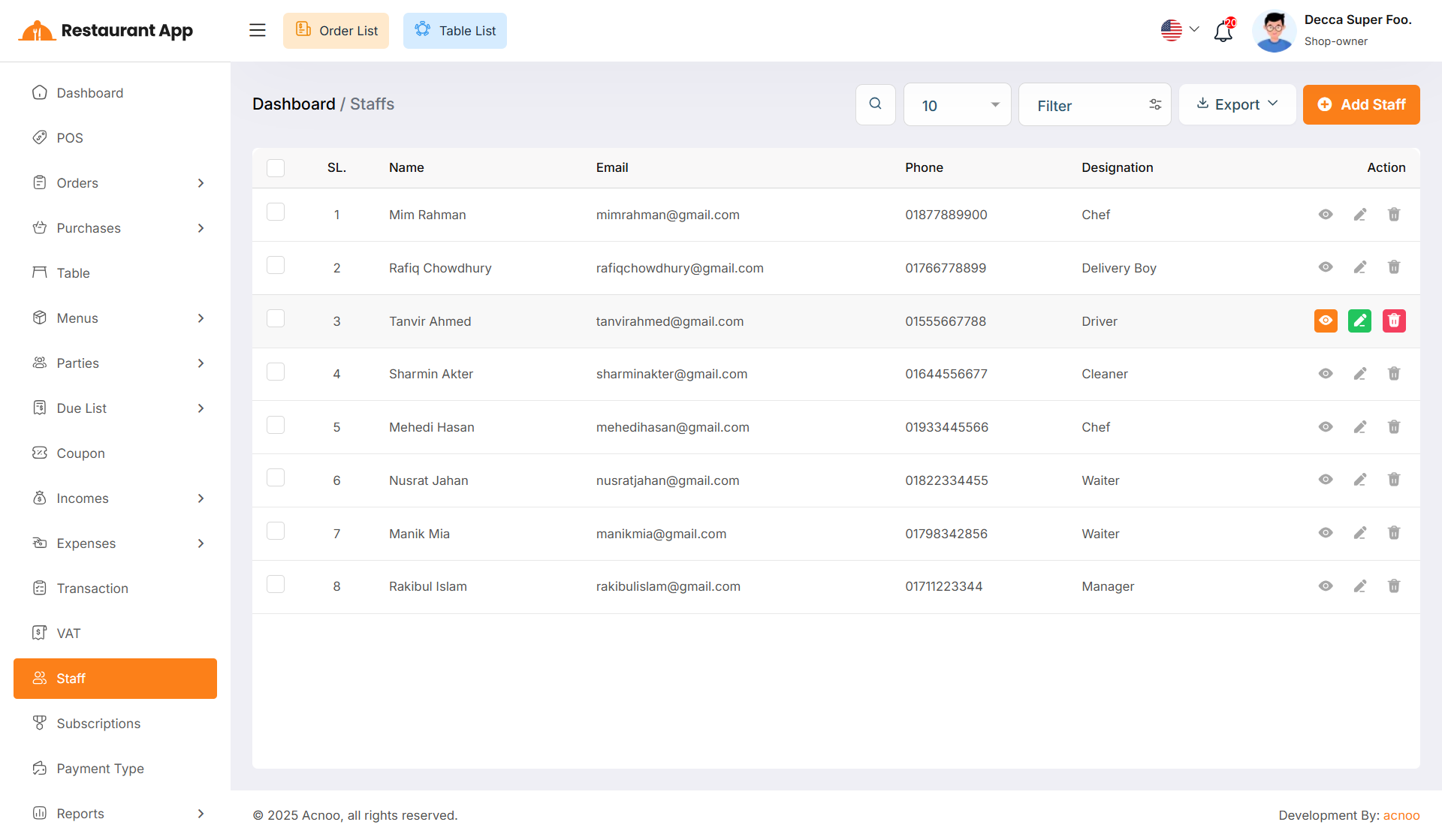 The Acoo Restaurant Admin Dashboard provides an intuitive interface for administrators to manage various aspects of the platform. It includes metrics on total Store, expired store, Paid Users, Free Users, subscription plan, income overview, and new register user.