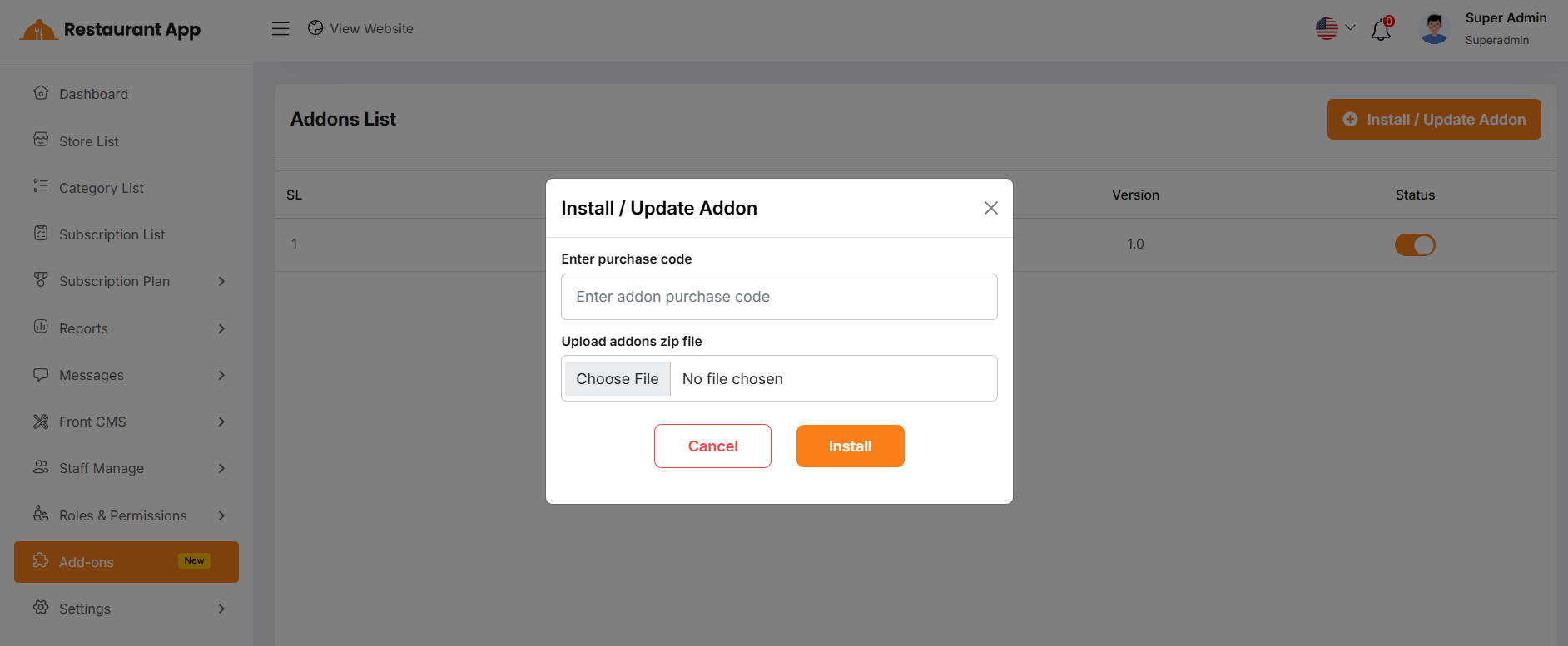 Note: Please click here to install your add-on. Before installing this add-on, you must first update the base project (Super-Admin.zip) to version 3.0