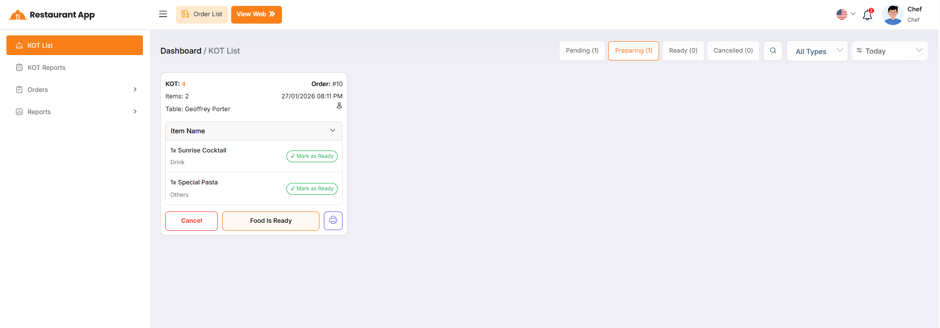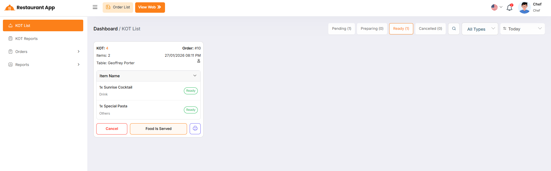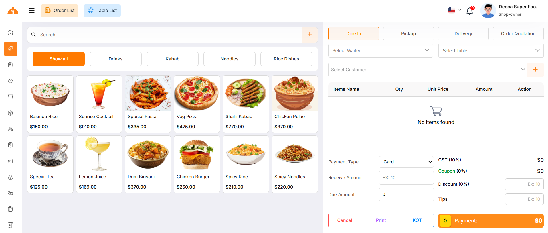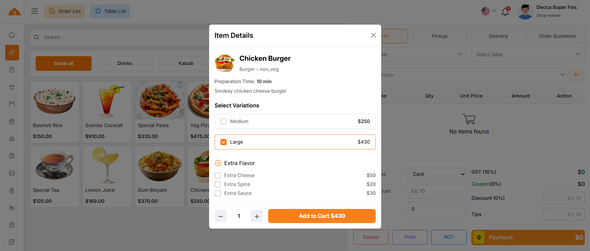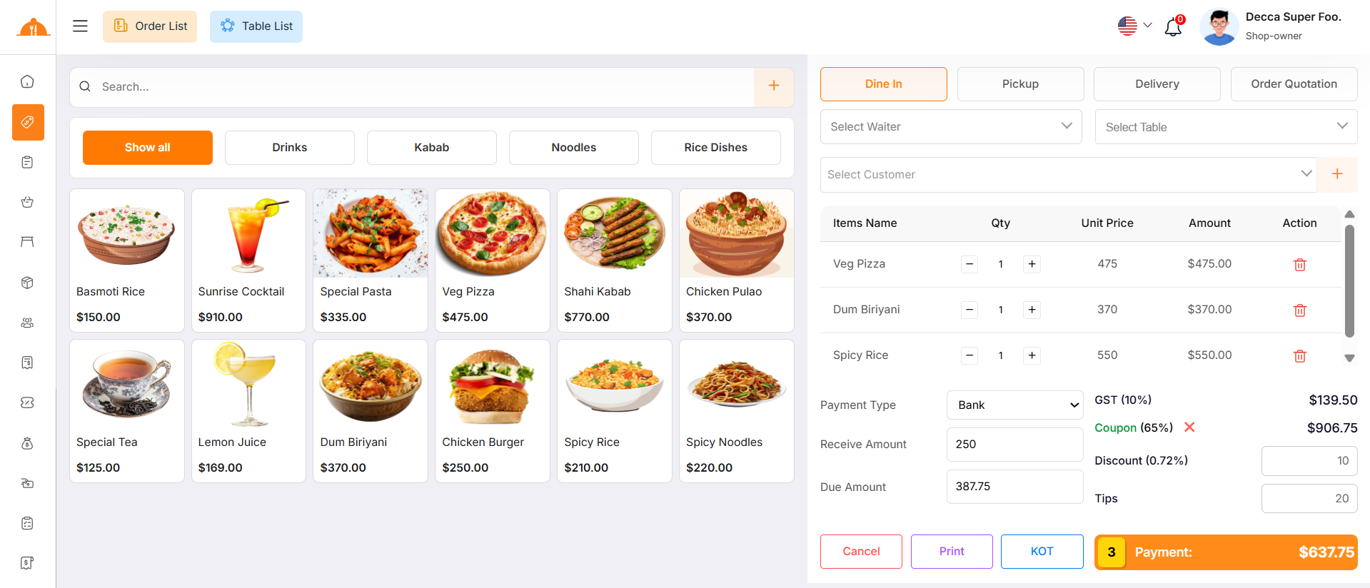 Table Assignment: The system automatically identifies and displays the specific table name (e.g., Table: Special) and its seating Capacity. This ensures that when the order is placed, the kitchen and waitstaff know exactly where to deliver the food.