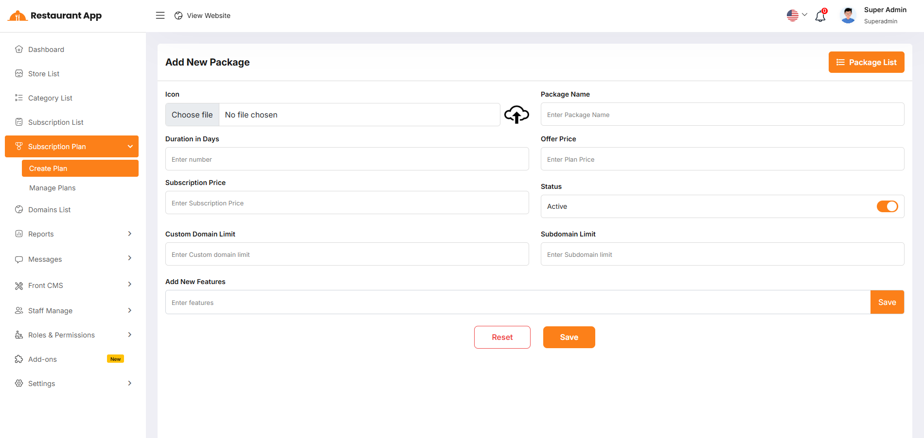Here, you have the option to create a plan according to your preferences. You can also add multiple features using the "Add New Feature" input field. Once you have completed filling out the form, simply click the "Save" button.