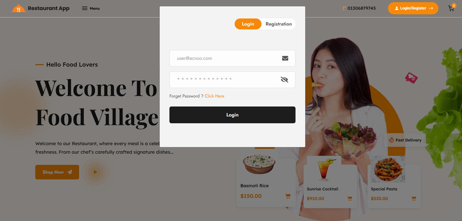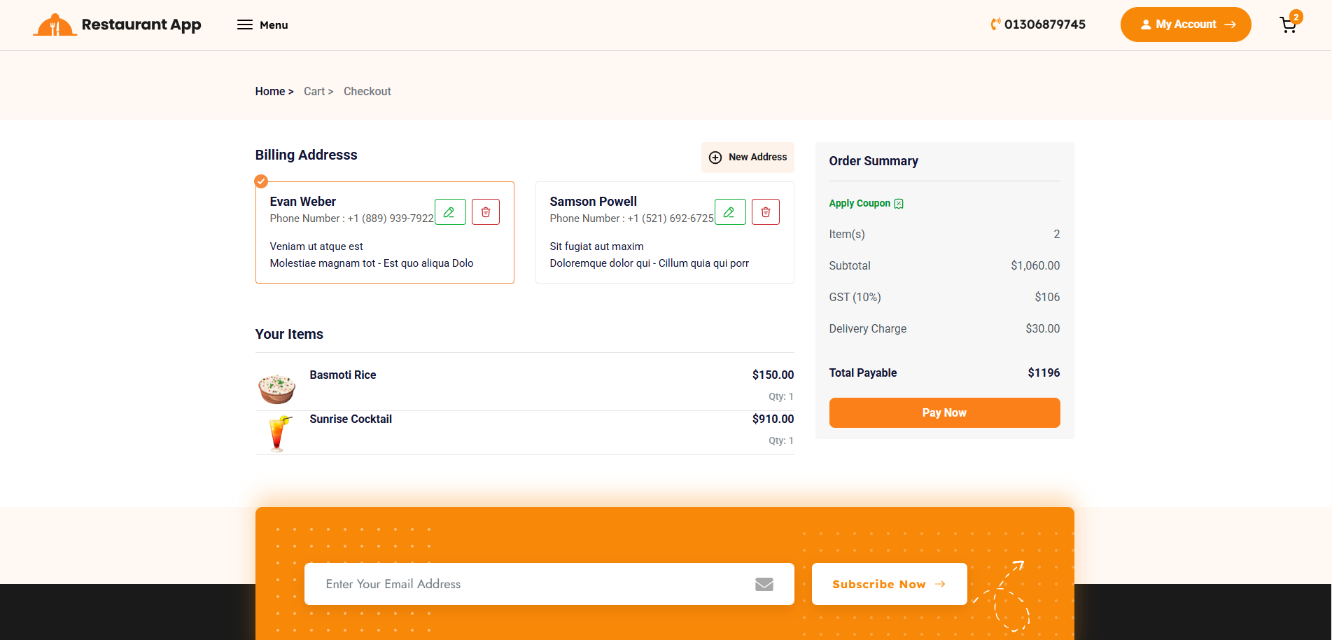The Checkout Page is the final destination for authenticated users to review their order details, select a delivery address, and proceed to payment. This page is automatically accessed after a user successfully logs in or registers via the authentication modal during the "Place Orders" workflow.