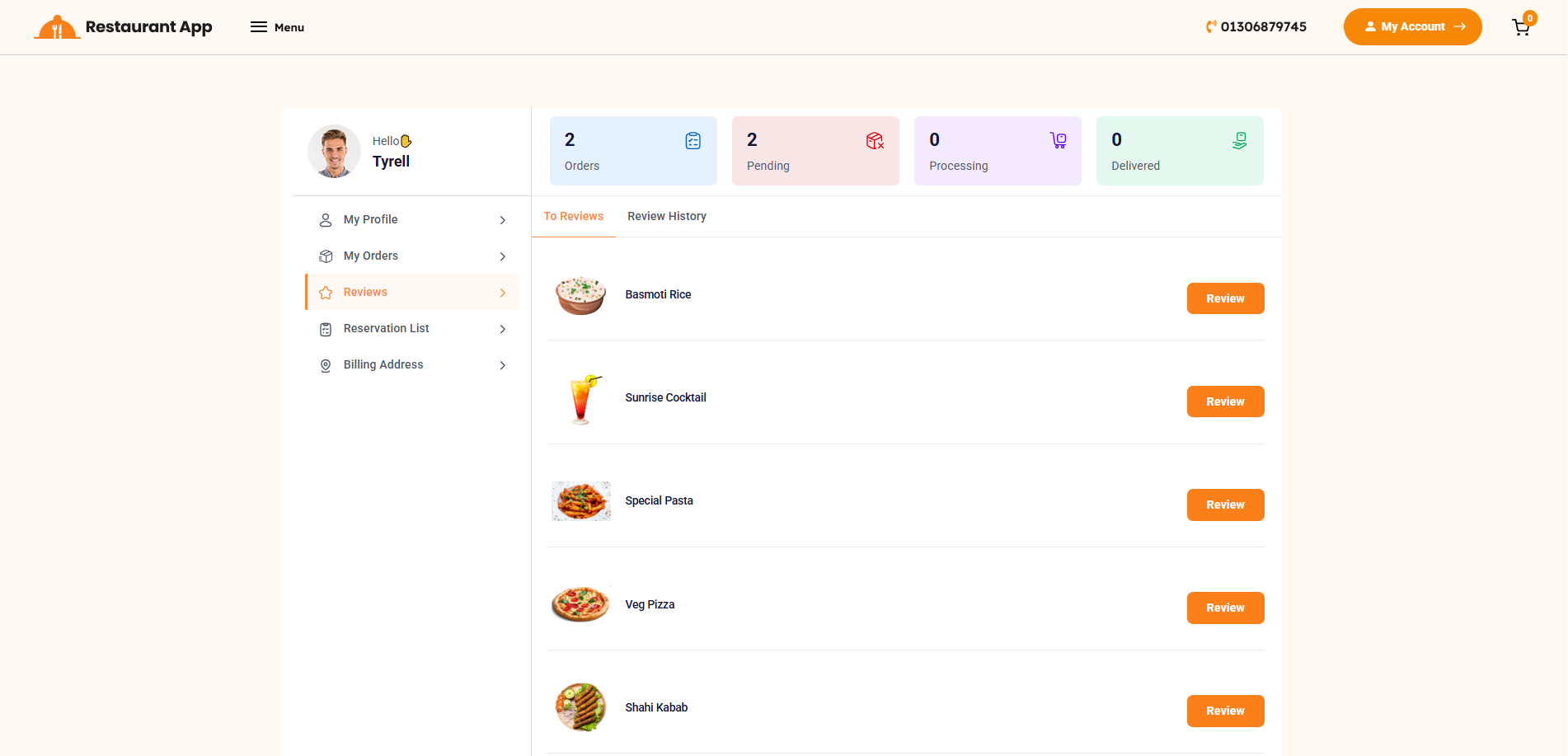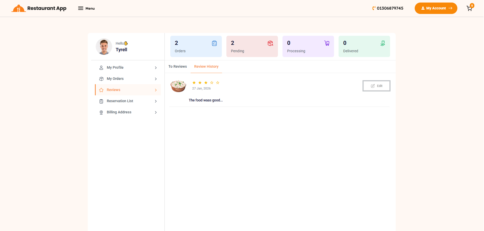 The My Profile page serves as the personal dashboard for authenticated customers. It provides a centralized location for users to manage their account details, track their dining activity, and review their interaction history with the restaurant.