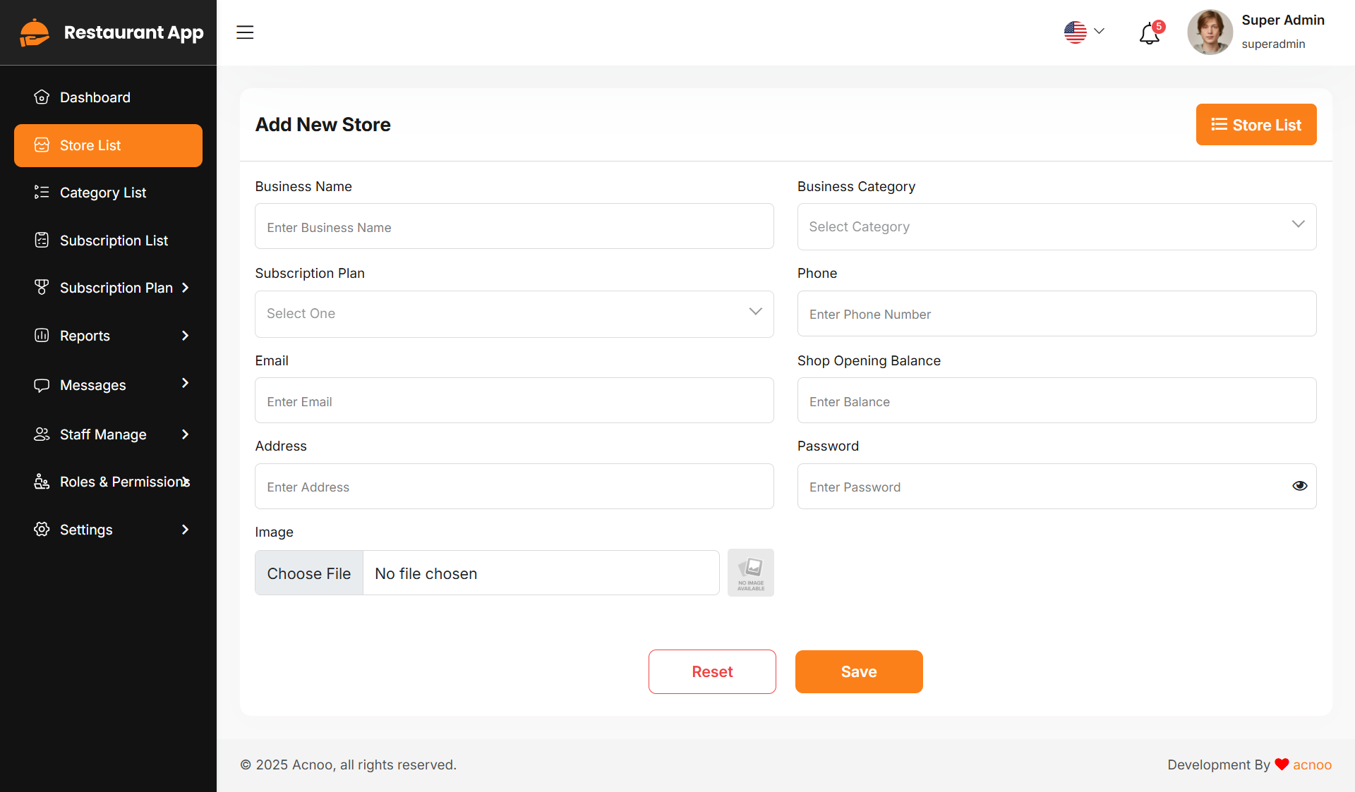 By clicking on the "Add Store" button, you can create a new business. You will need to fill in the necessary fields. Here is the screenshot of the create business page.