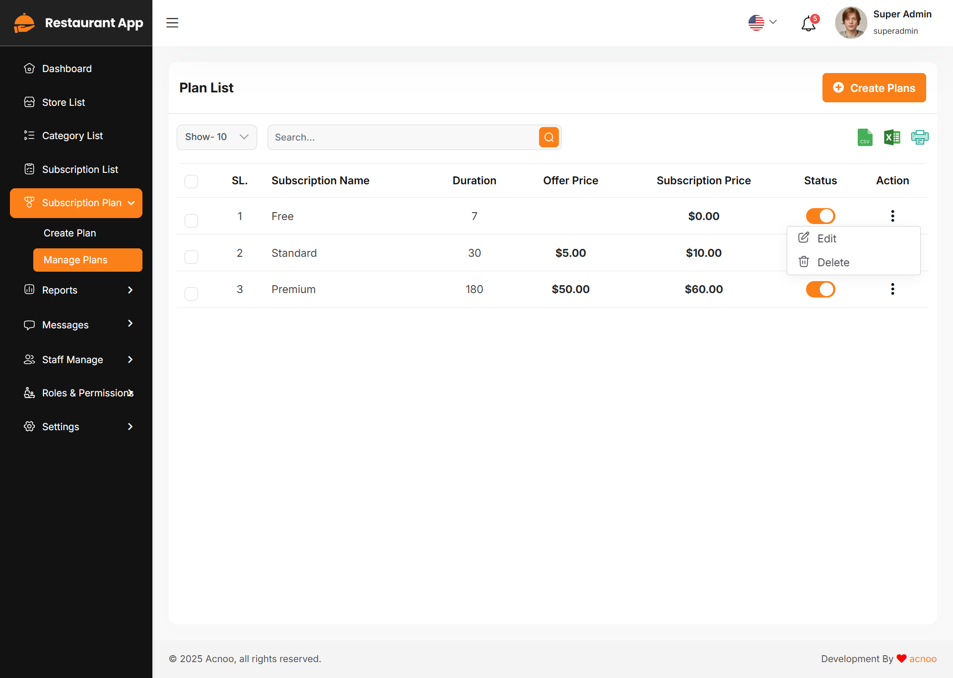 Here, you can view a list of available plans with filtering options. You can also change the plan status from this page. Additionally, options to view, edit, delete, and multi-delete plans are available.