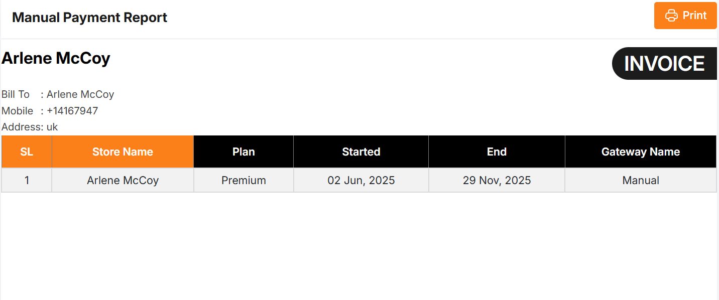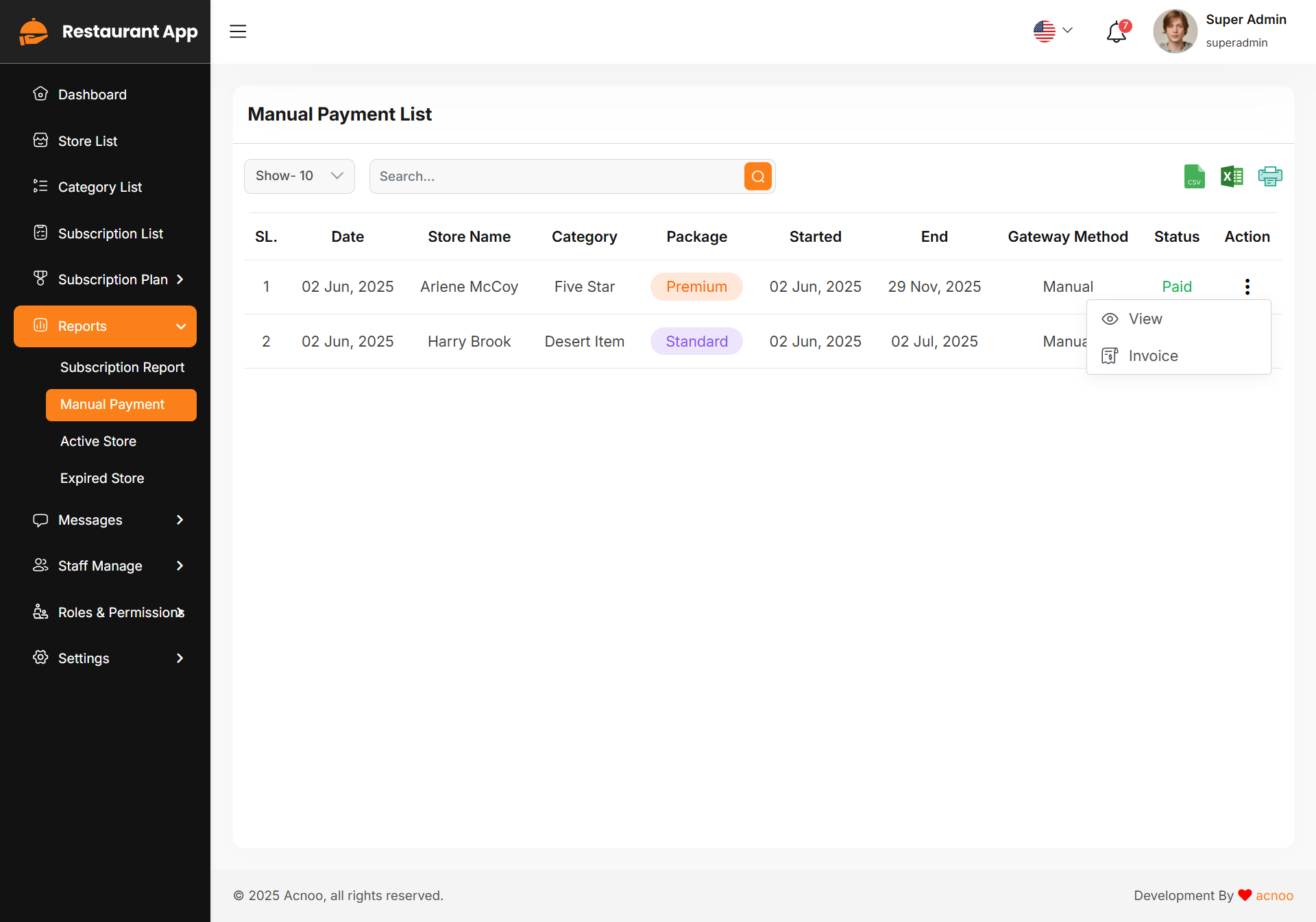 The Manual Payment List provides a comprehensive view of all manual payment requests, including details about the store, subscription plan, payment status, and available actions. This list is essential for tracking and processing payments made outside the automated system.