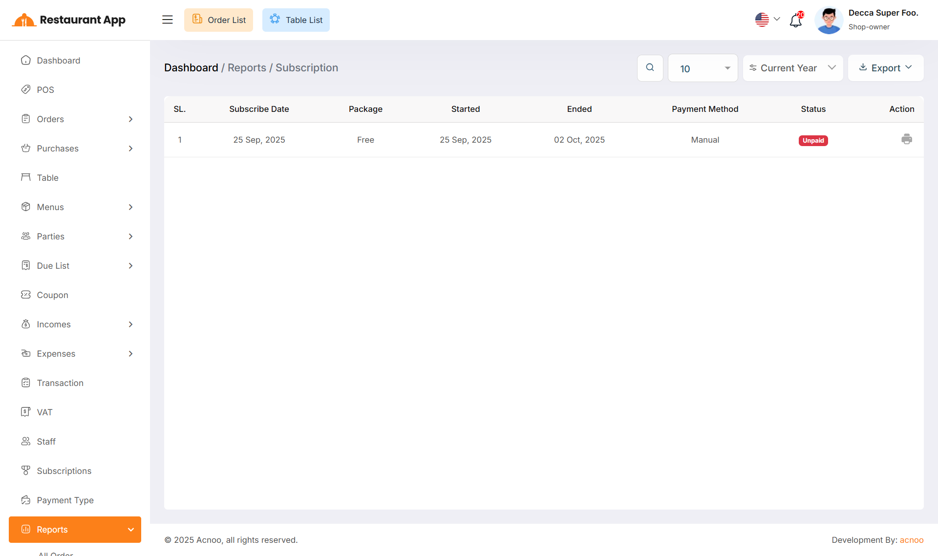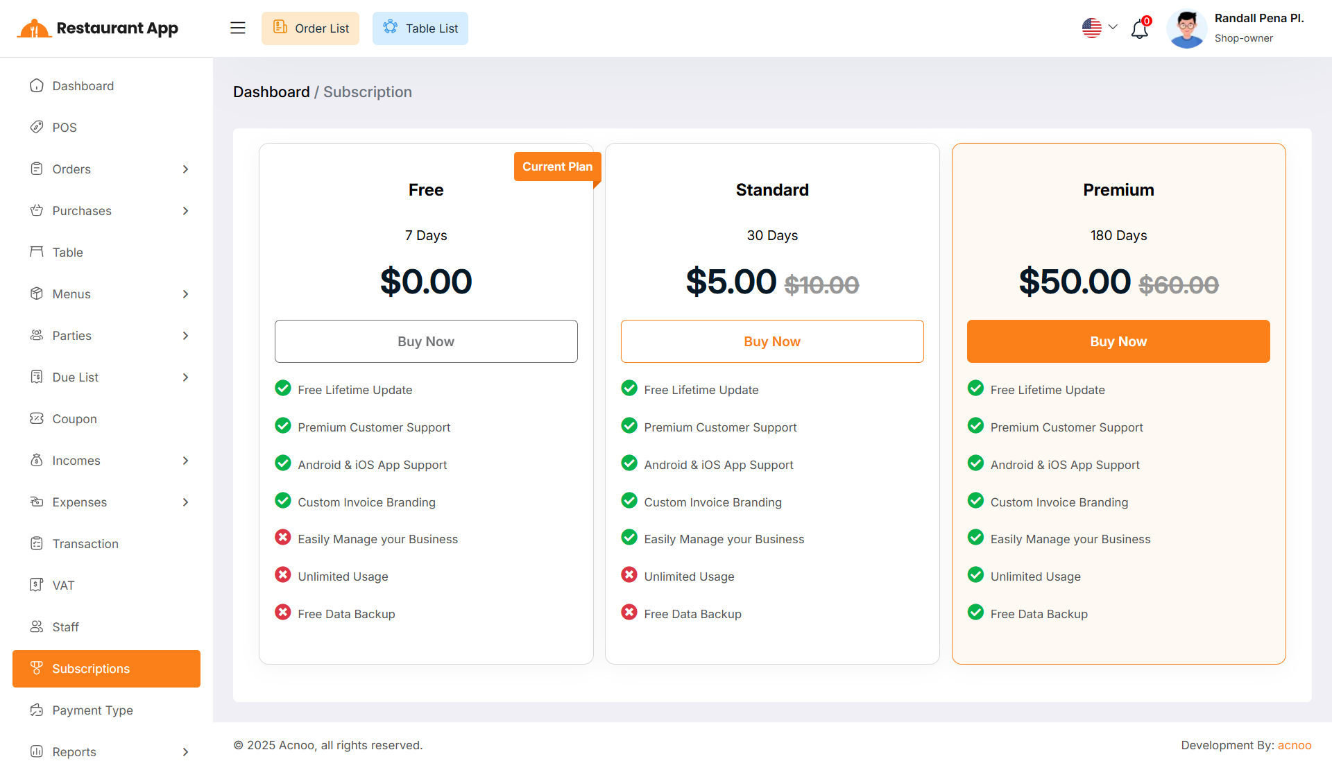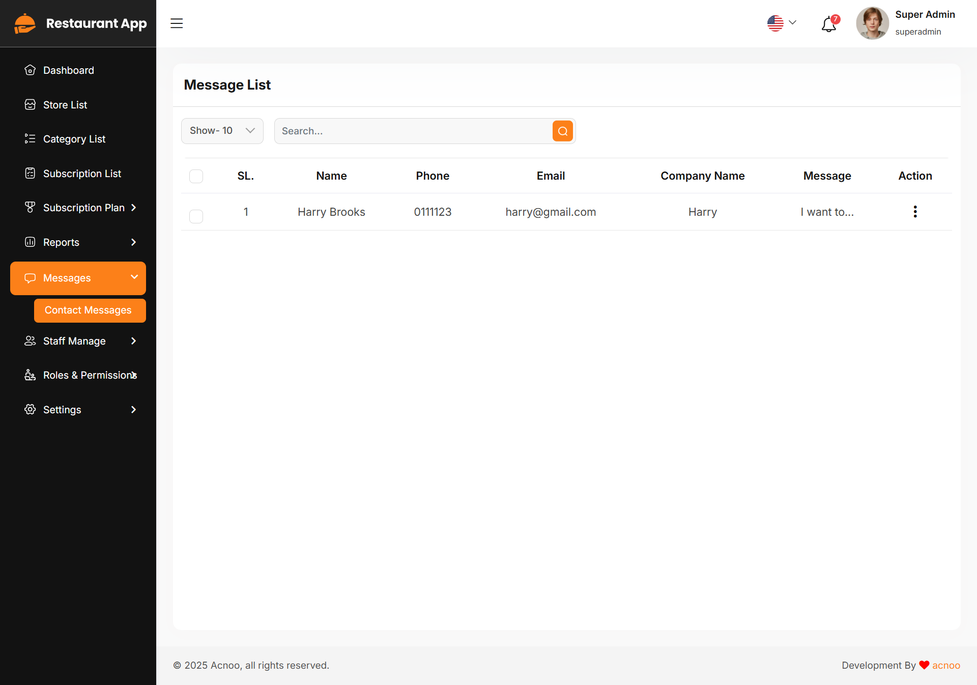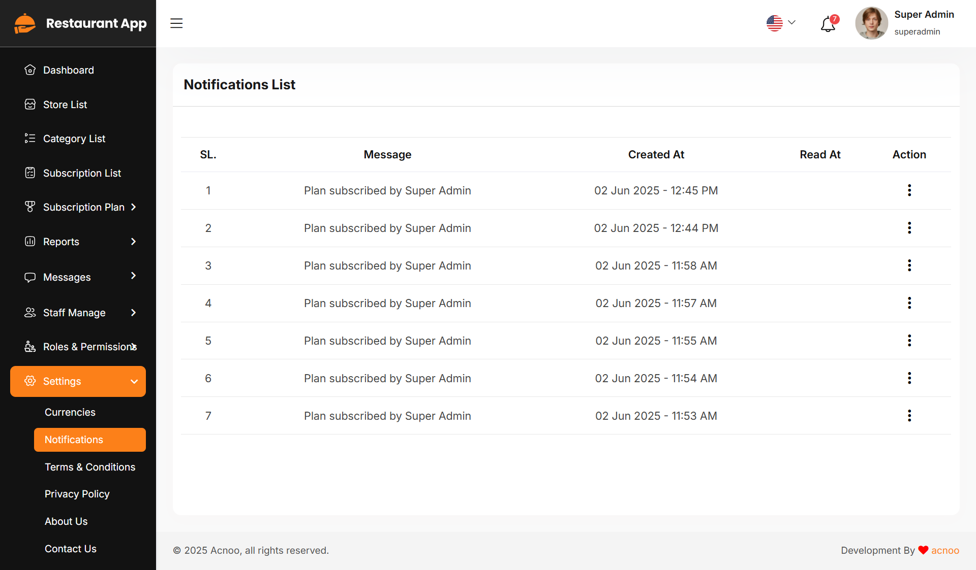 The Acoo Restaurant Admin Dashboard provides an intuitive interface for administrators to manage various aspects of the platform. It includes metrics on total Store, expired store, Paid Users, Free Users, subscription plan, income overview, and new register user.