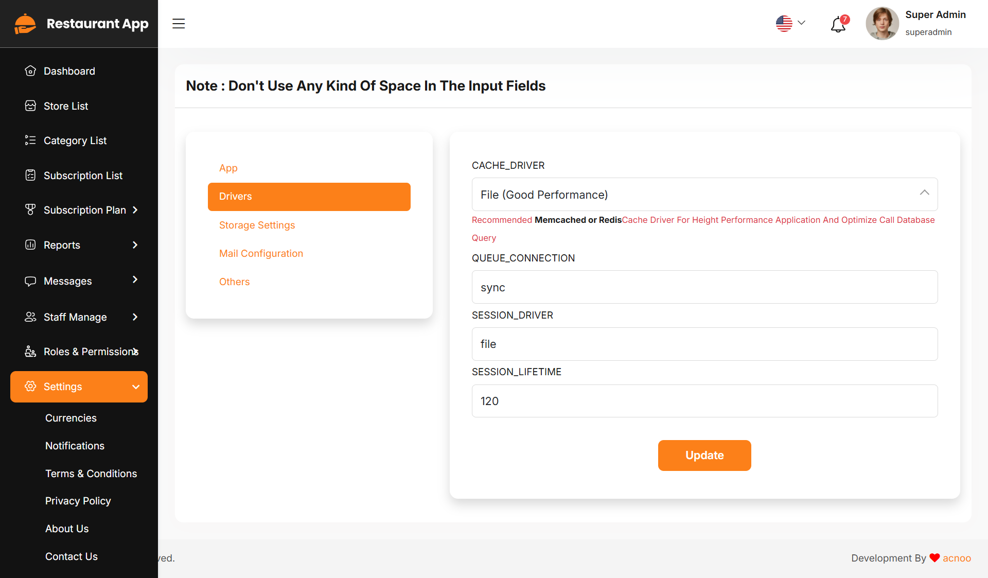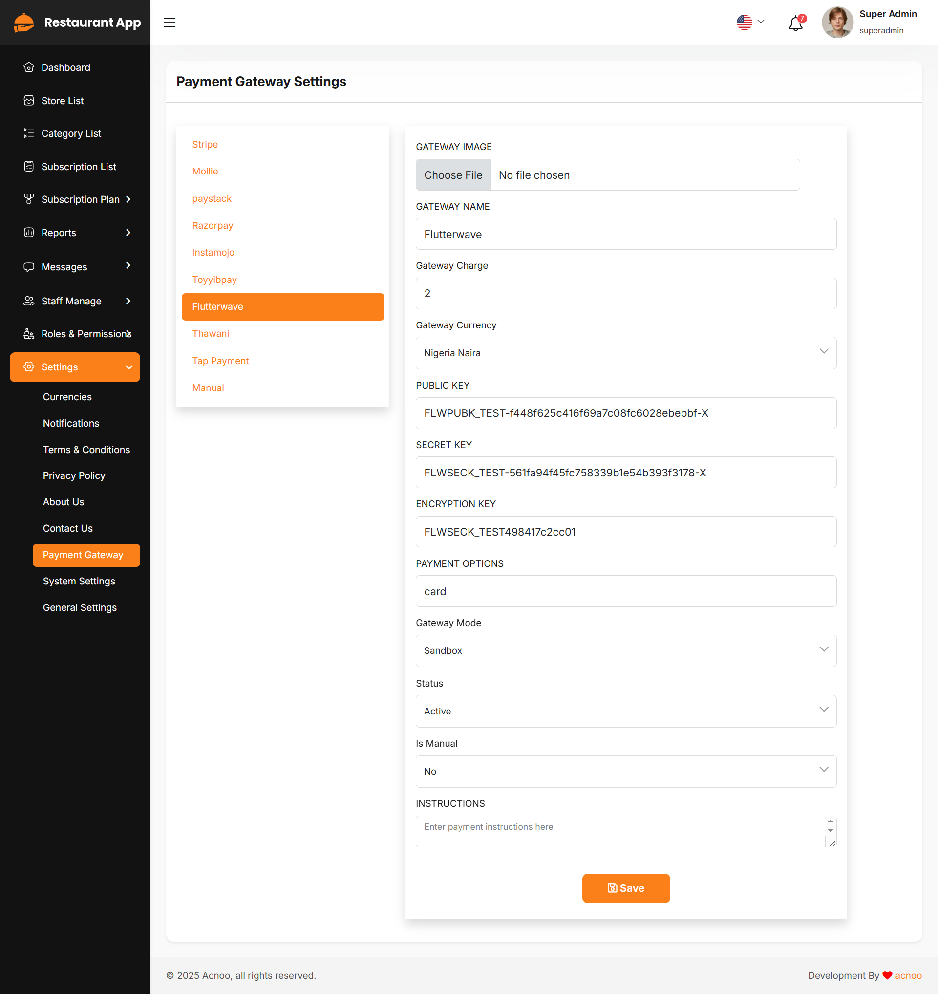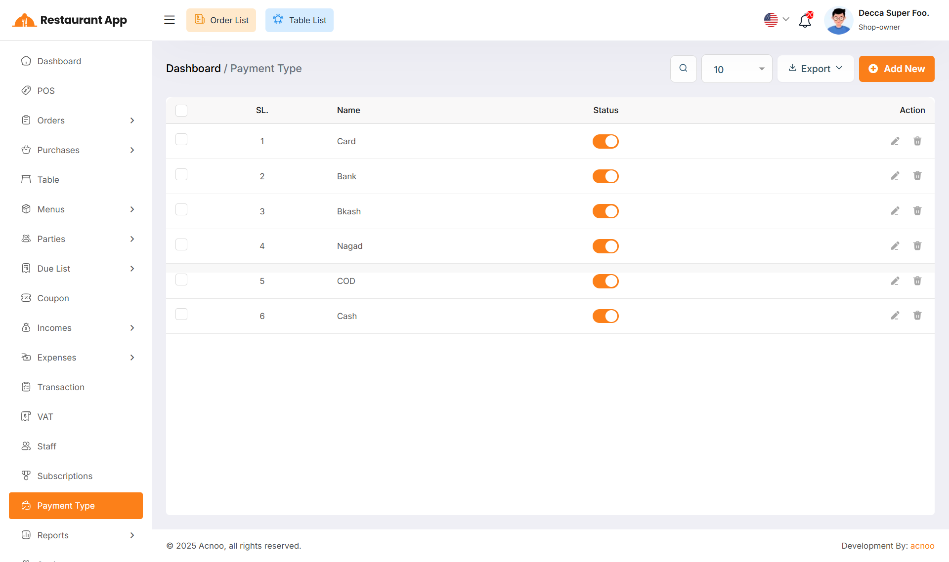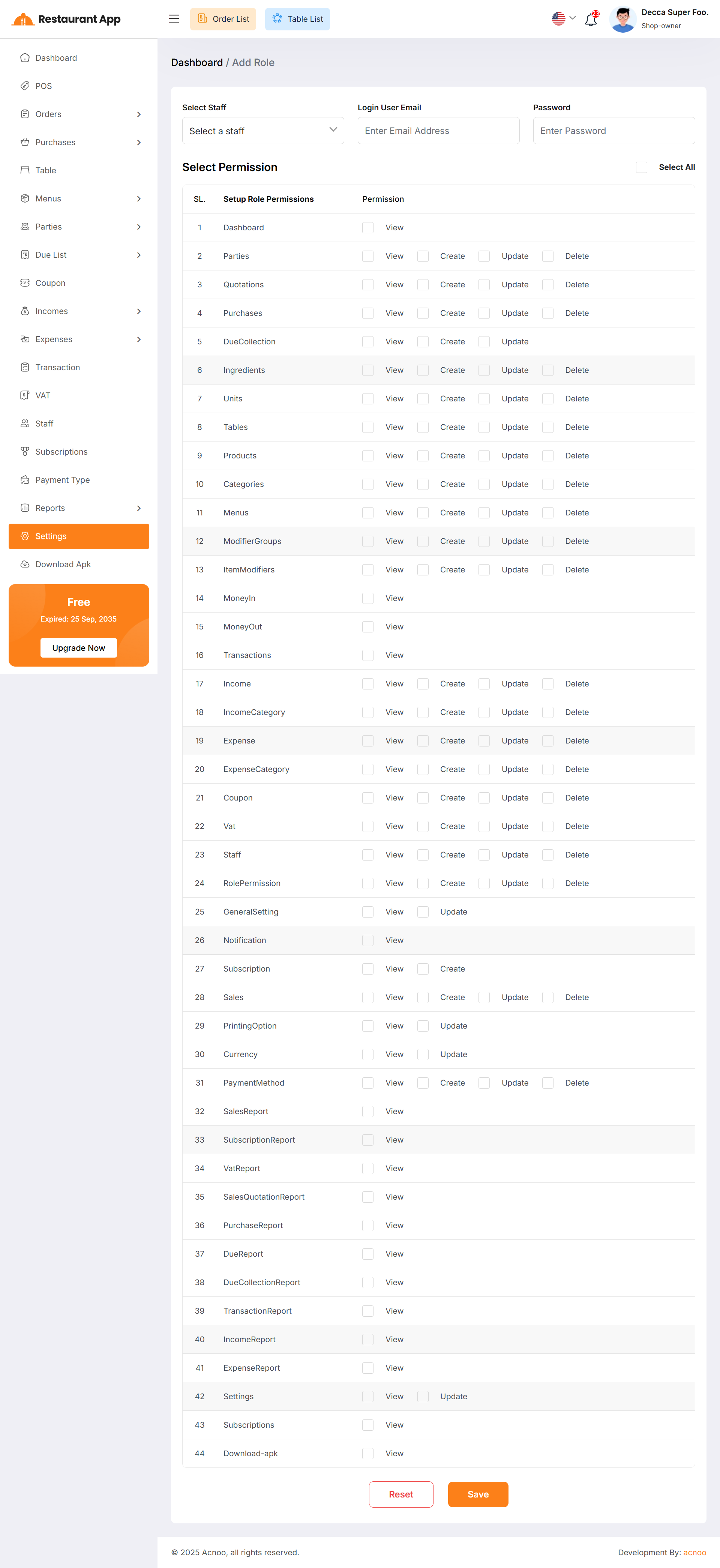 The Acoo Restaurant Admin Dashboard provides an intuitive interface for administrators to manage various aspects of the platform. It includes metrics on total Store, expired store, Paid Users, Free Users, subscription plan, income overview, and new register user.