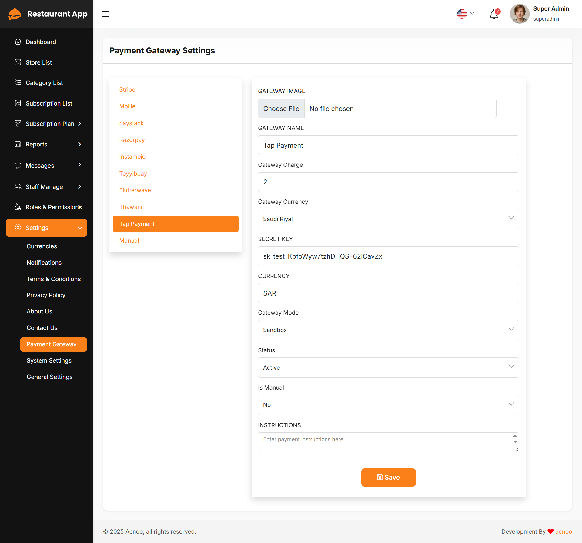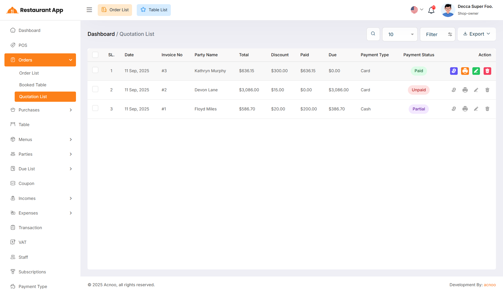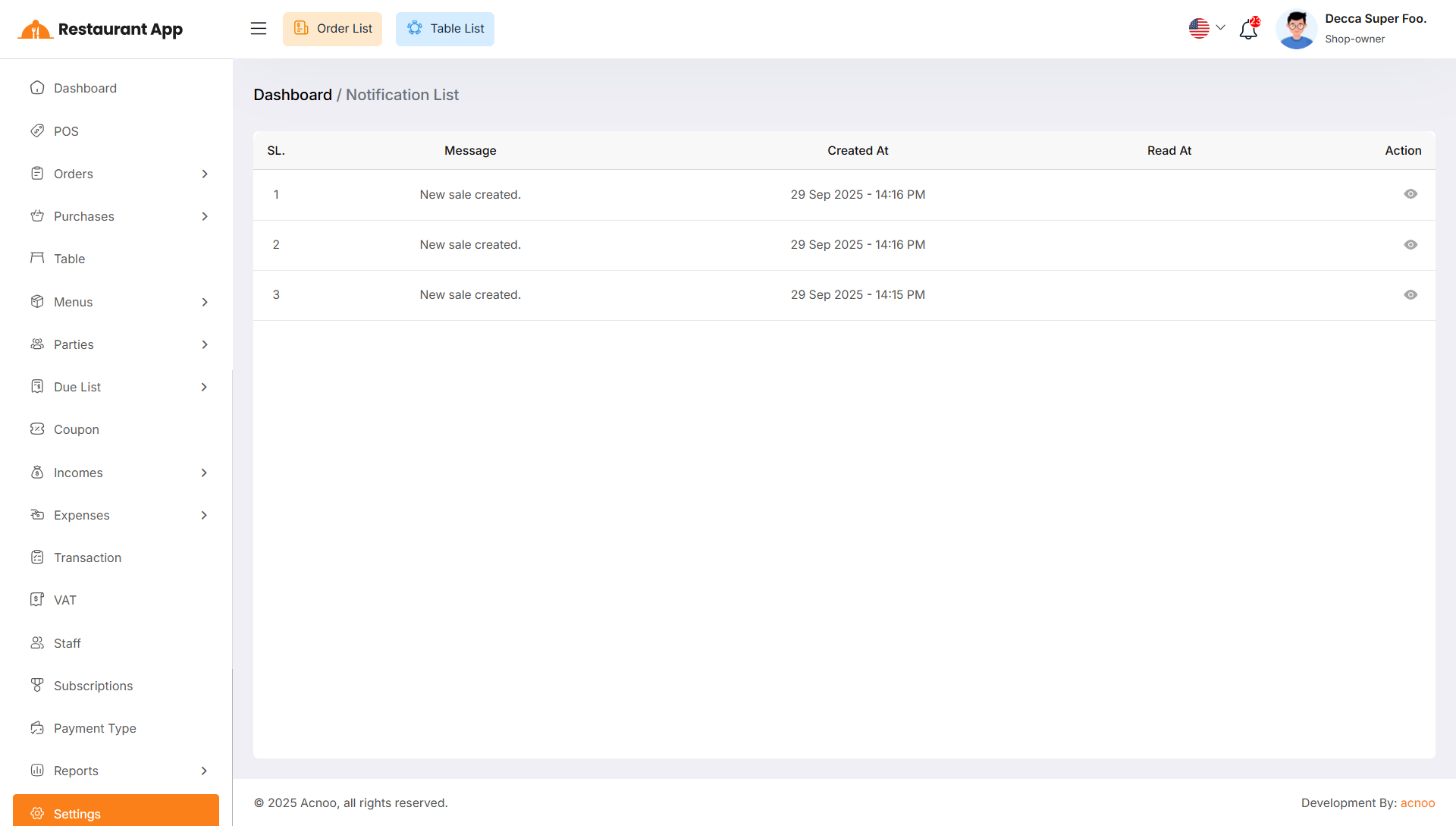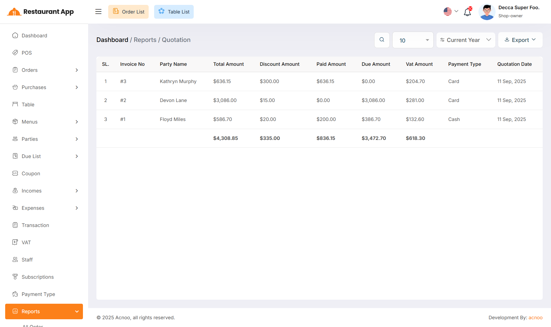 The Acoo Restaurant Admin Dashboard provides an intuitive interface for administrators to manage various aspects of the platform. It includes metrics on total Store, expired store, Paid Users, Free Users, subscription plan, income overview, and new register user.