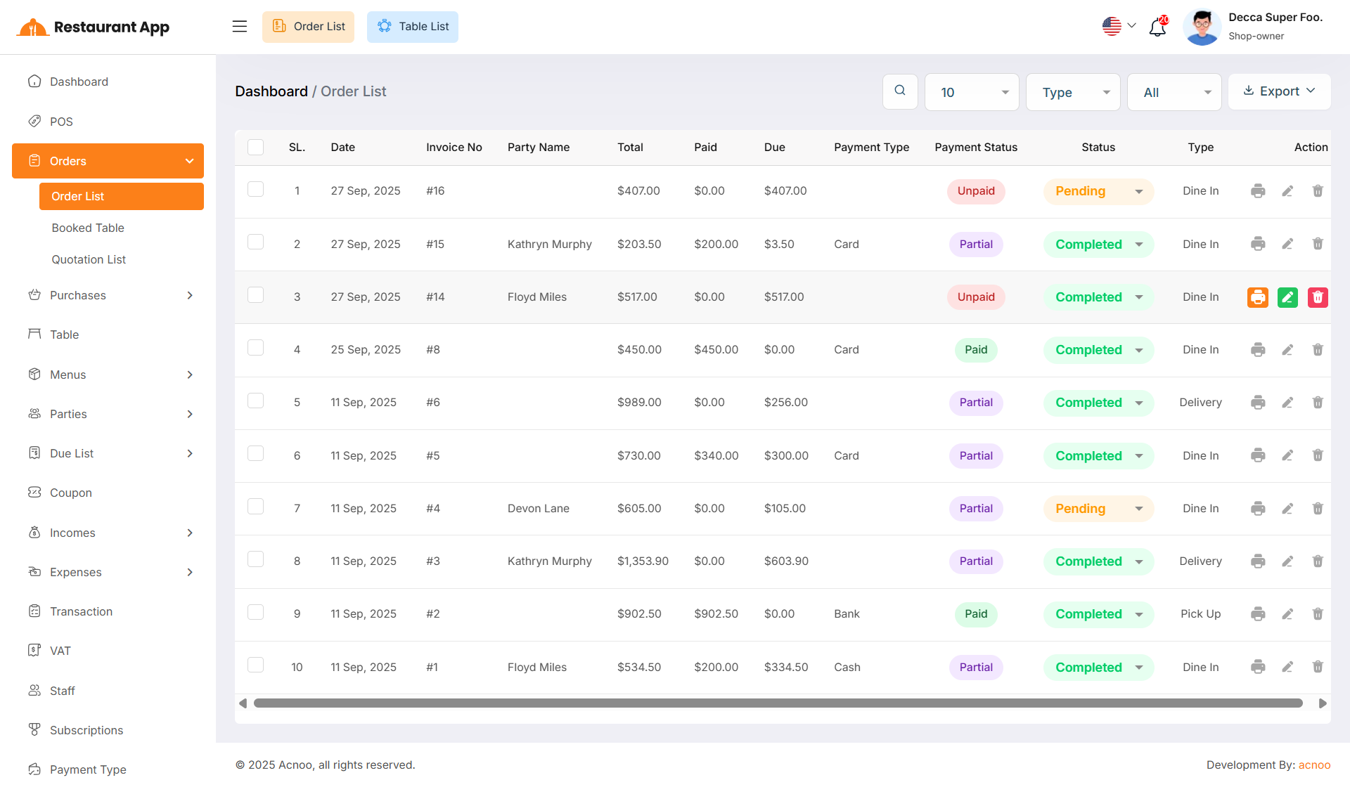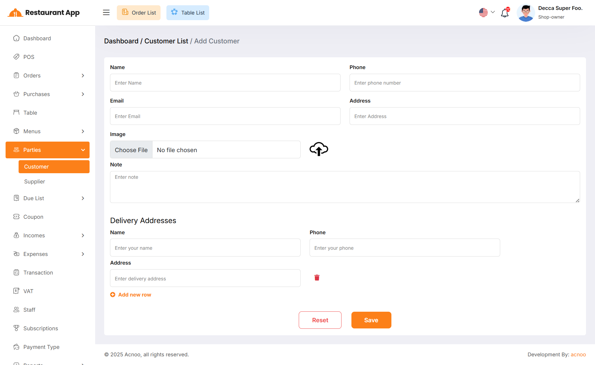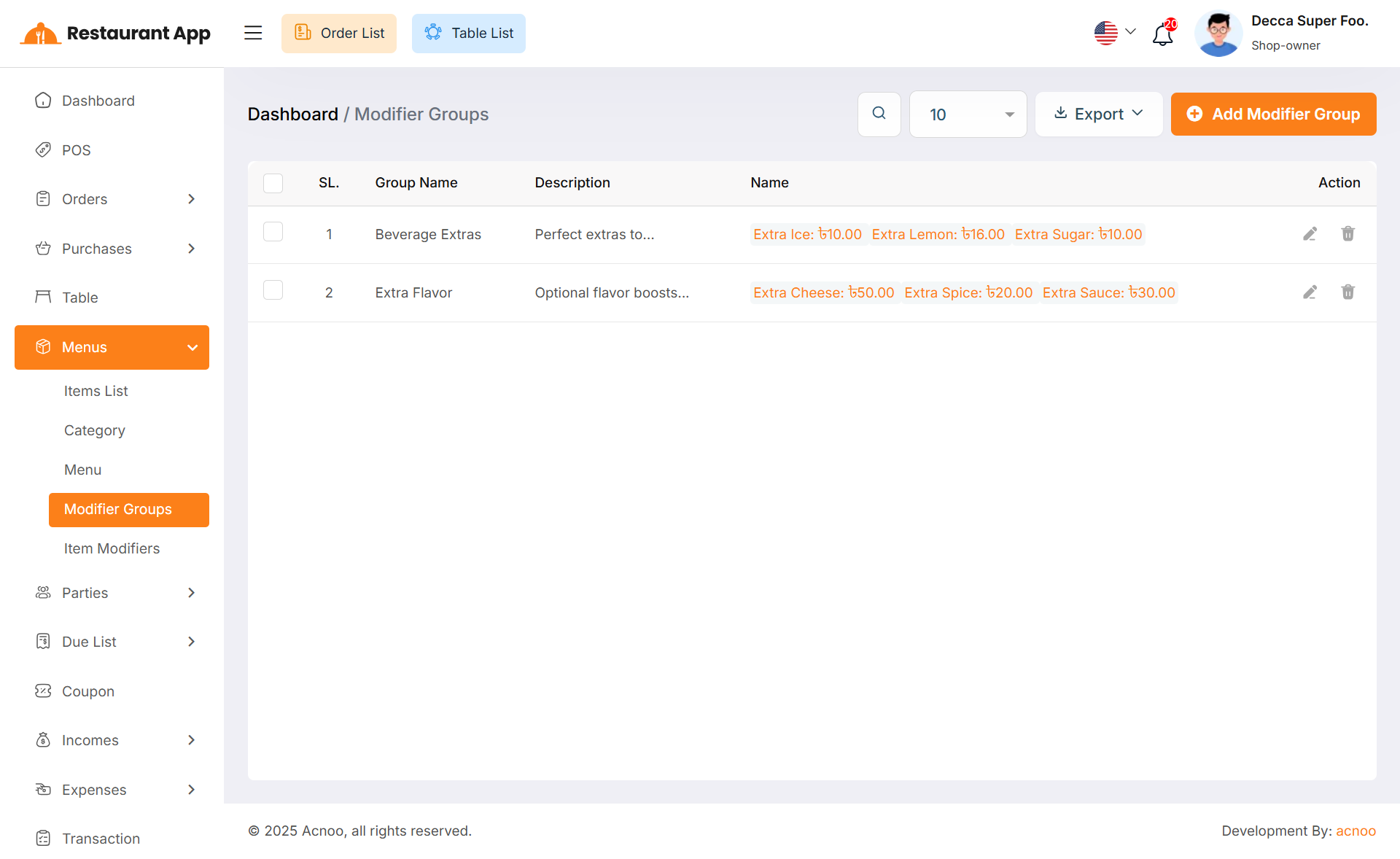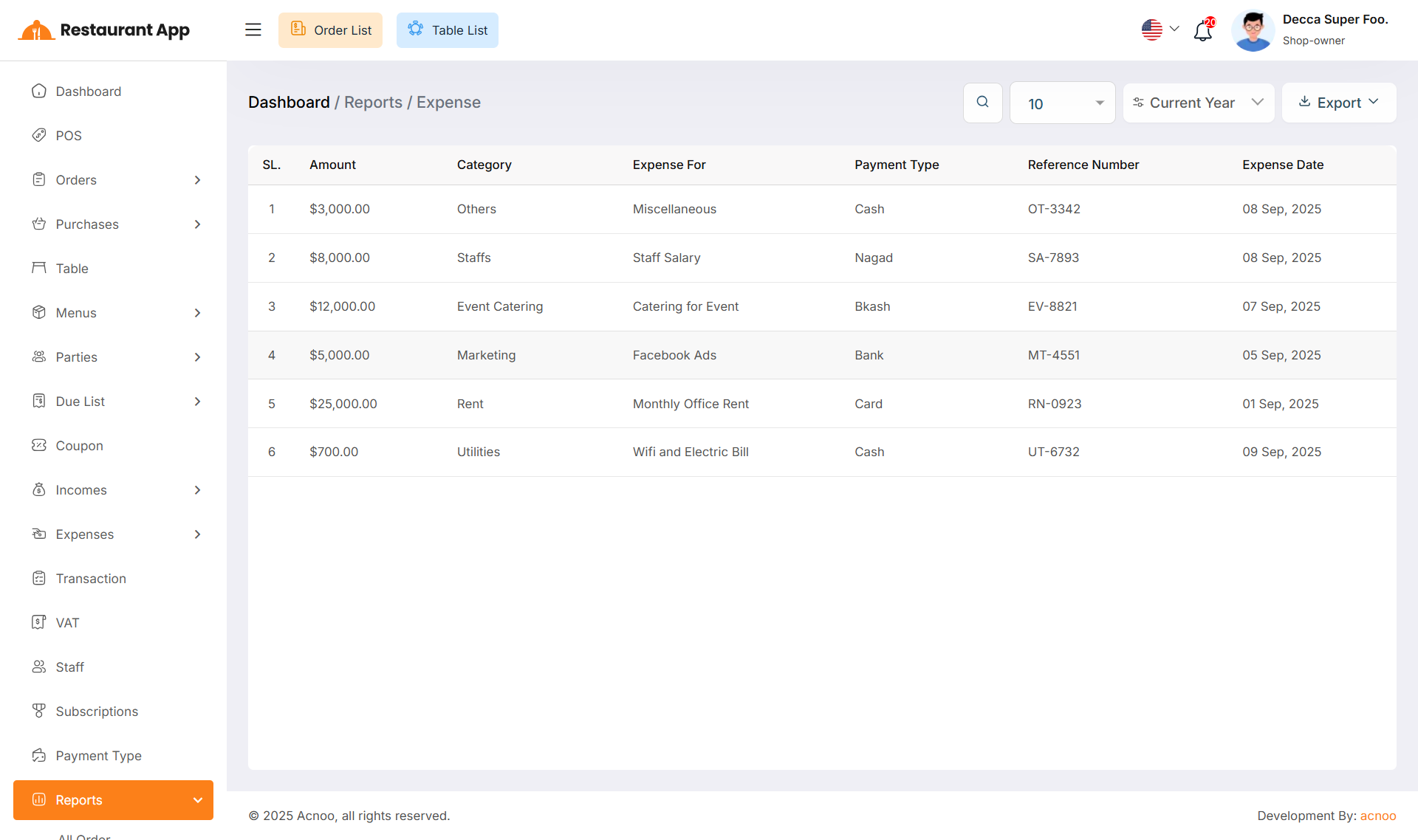 The Acoo Restaurant Admin Dashboard provides an intuitive interface for administrators to manage various aspects of the platform. It includes metrics on total Store, expired store, Paid Users, Free Users, subscription plan, income overview, and new register user.