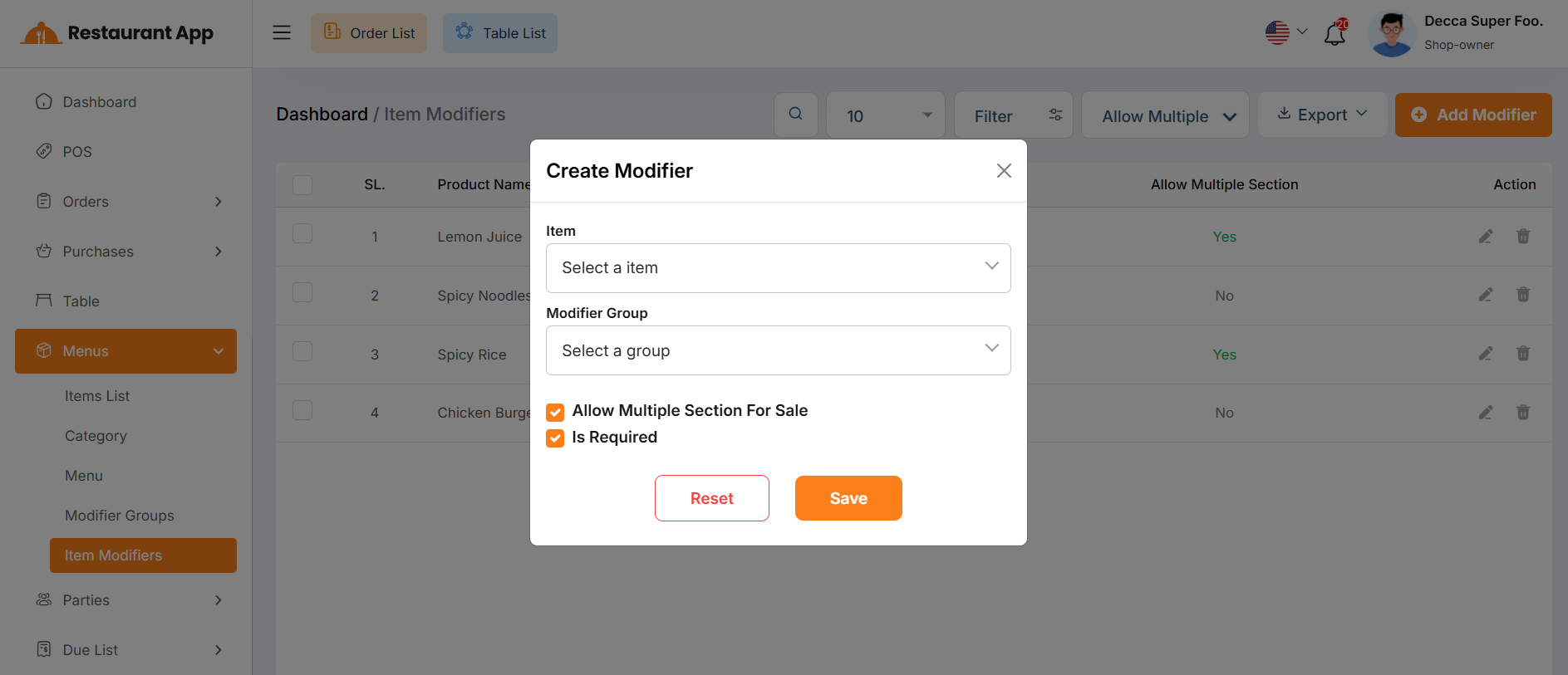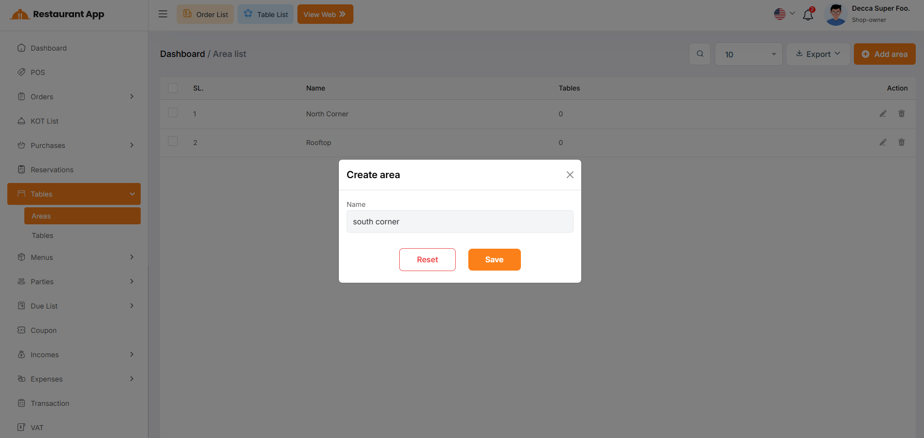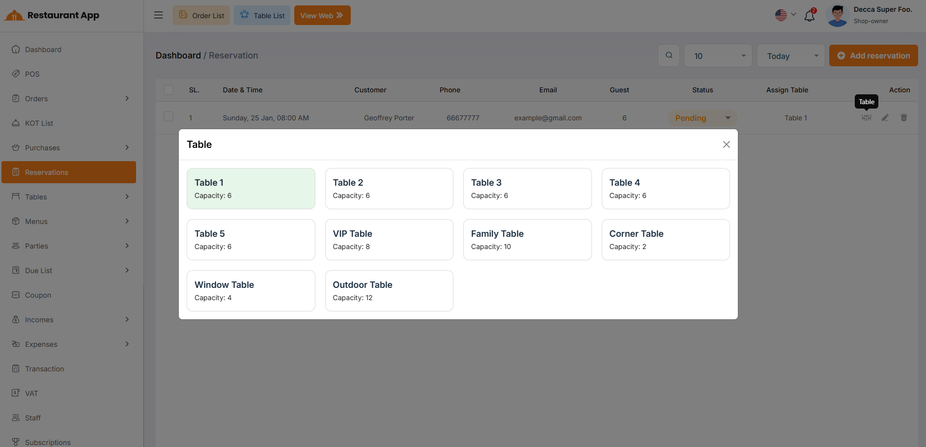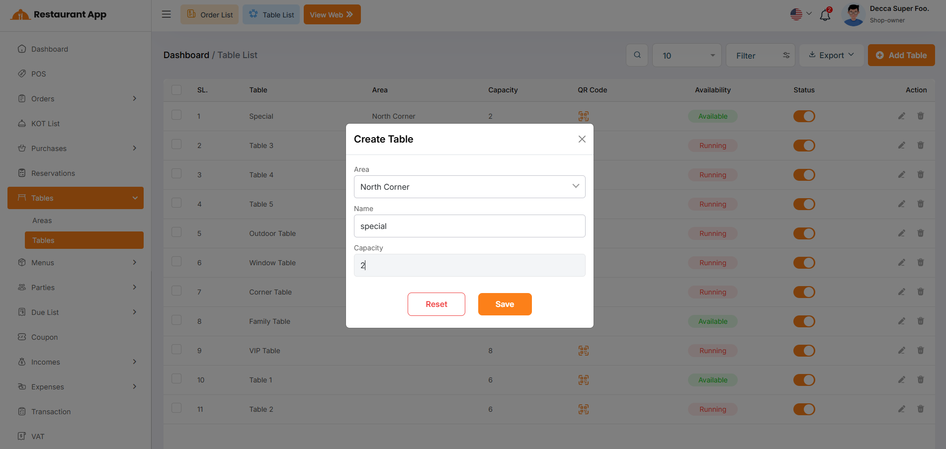 Table Assignment: The system automatically identifies and displays the specific table name (e.g., Table: Special) and its seating Capacity. This ensures that when the order is placed, the kitchen and waitstaff know exactly where to deliver the food.