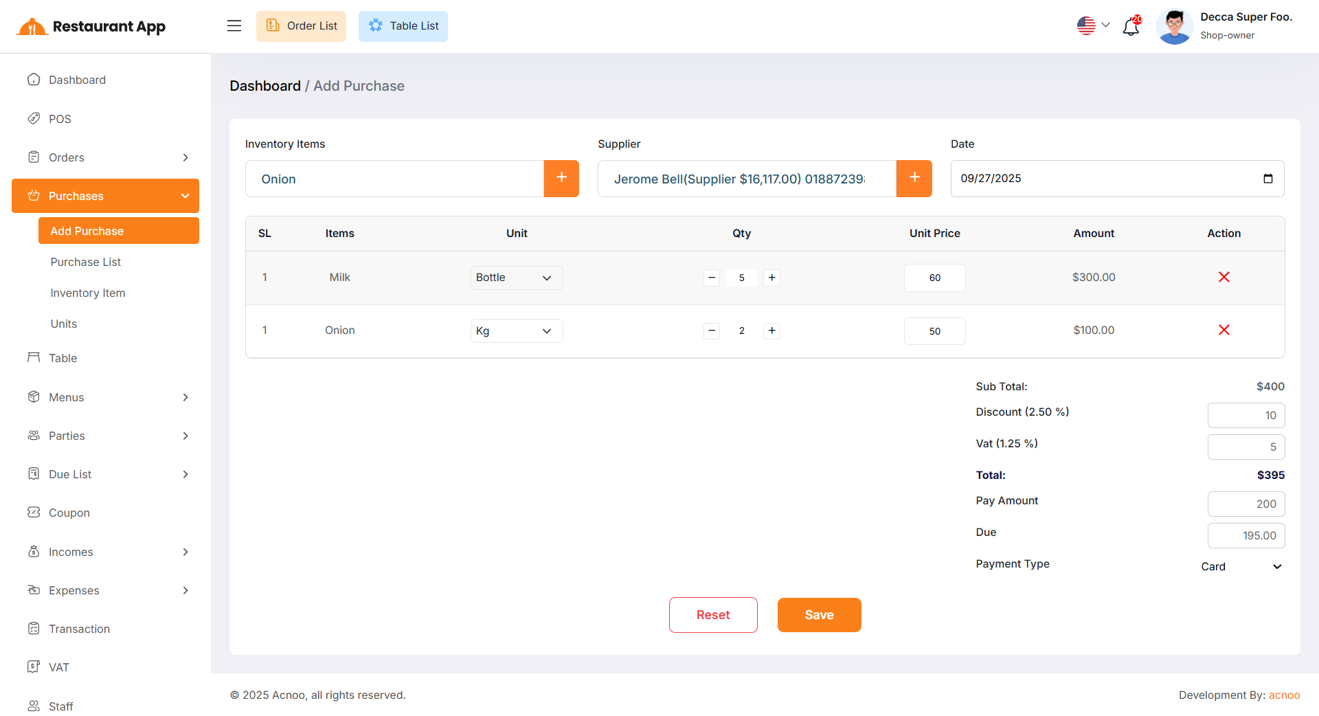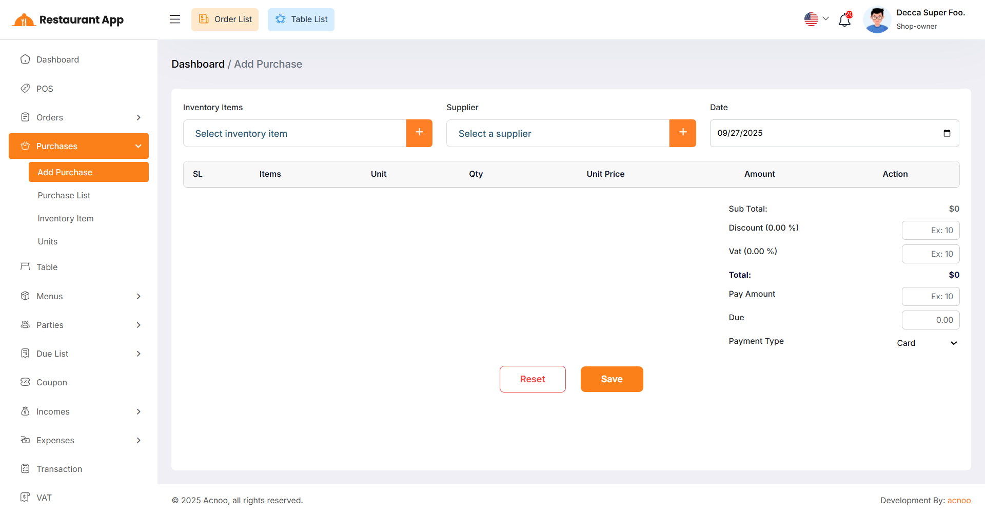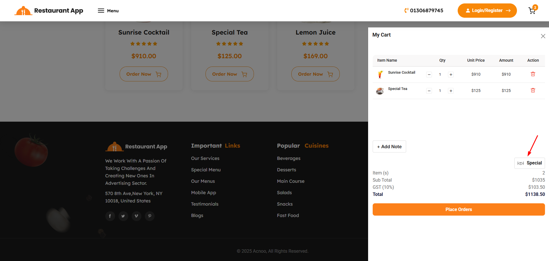 Place Orders Button: Clicking this primary orange action button signals the system to begin the final invoice calculation and payment transition.