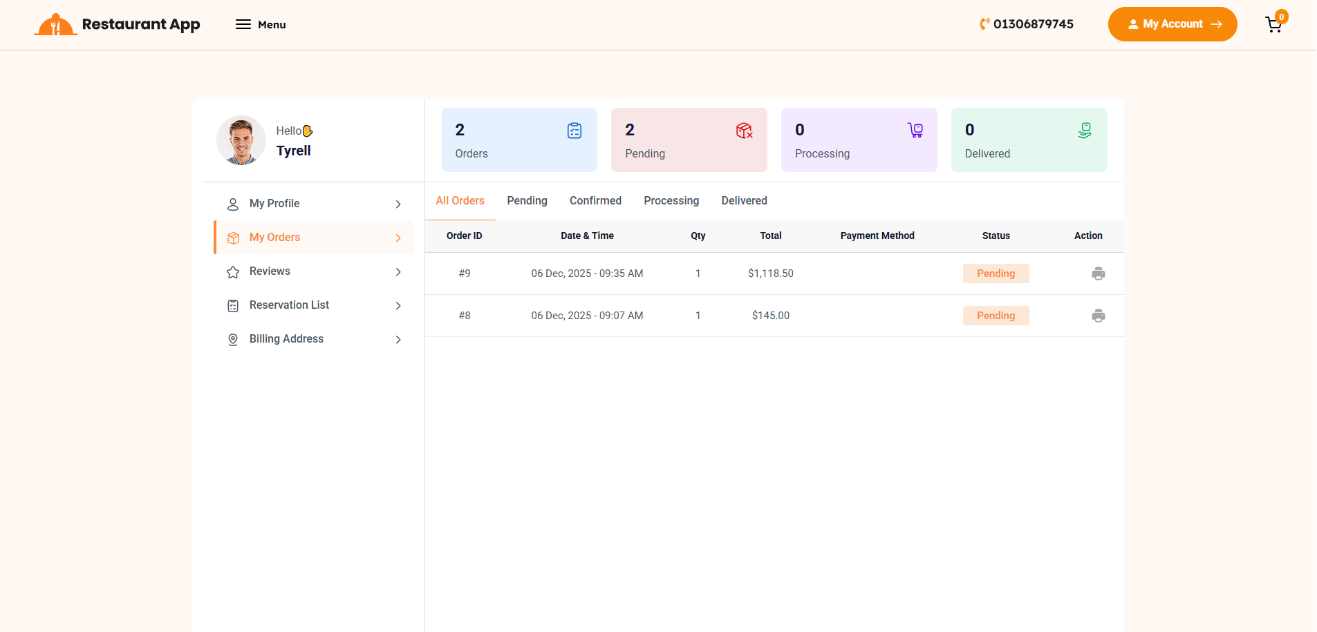 The My Profile page serves as the personal dashboard for authenticated customers. It provides a centralized location for users to manage their account details, track their dining activity, and review their interaction history with the restaurant.