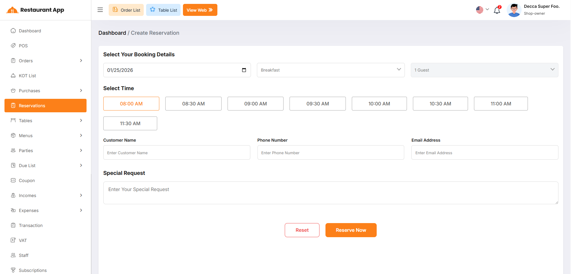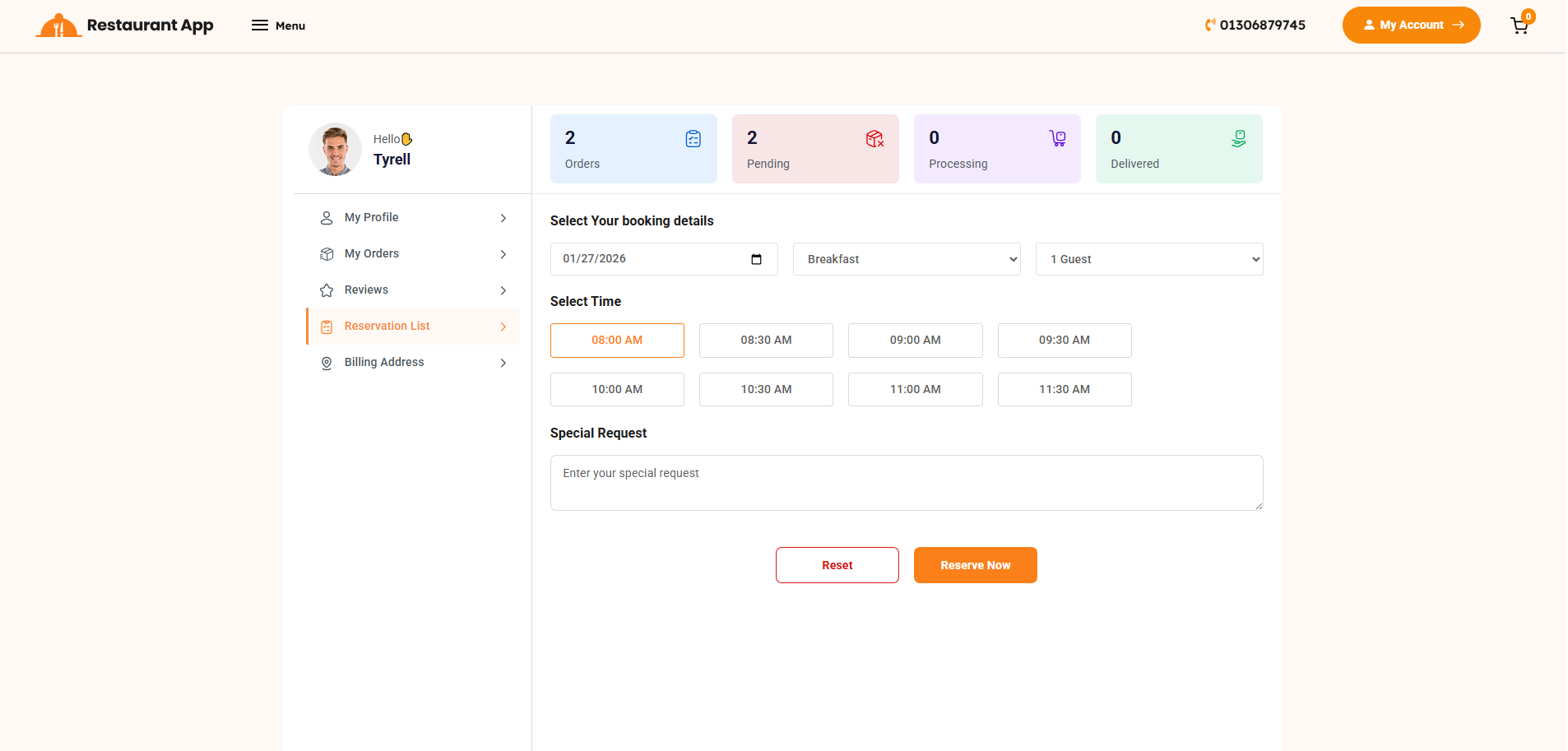 The Reservation List section, located within the customer dashboard, provides a comprehensive overview of all table booking requests. This interface allows guests to manage their upcoming dining plans and schedule new reservations directly from their profile.