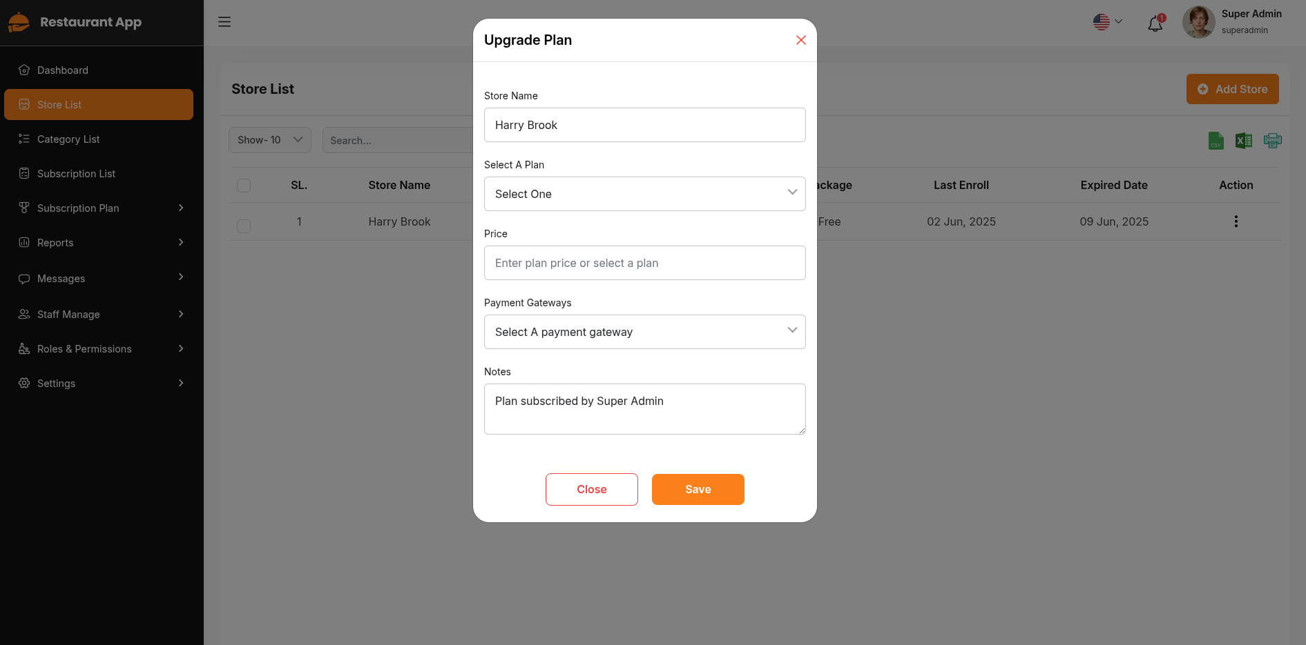 If you need to upgrade the plan for any business, click on the "Upgrade Plan" button. You will likely see a popup for this. Here, you can update the plan, gateway, price, and notes. When you select a plan, the price input field will automatically fill in according to the selected plan, but you can also change the price manually. If desired, you can add a note by filling in the notes input field.